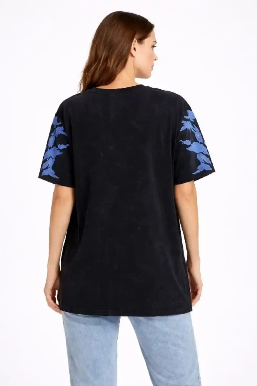 Asit Yıkamalı Oversize Tişört Mavi Kelebek Baskılı Dijital Print Bisiklet Yaka Streetwear T-Shirt - Siyah