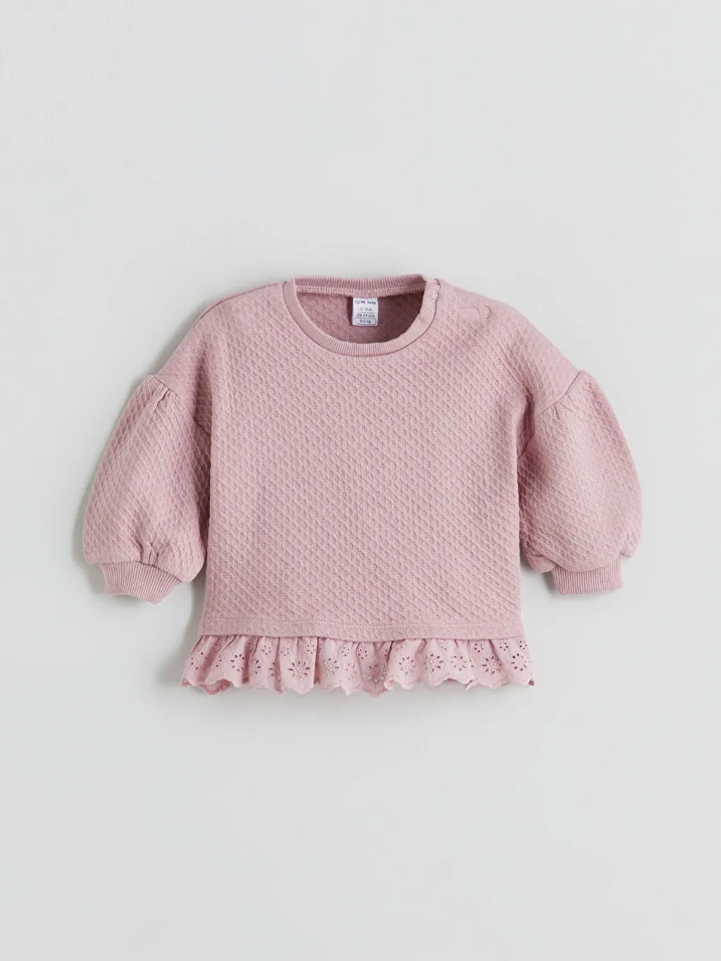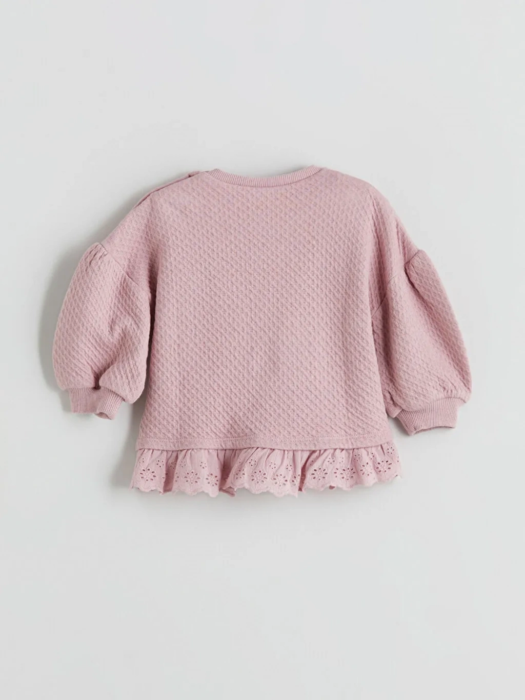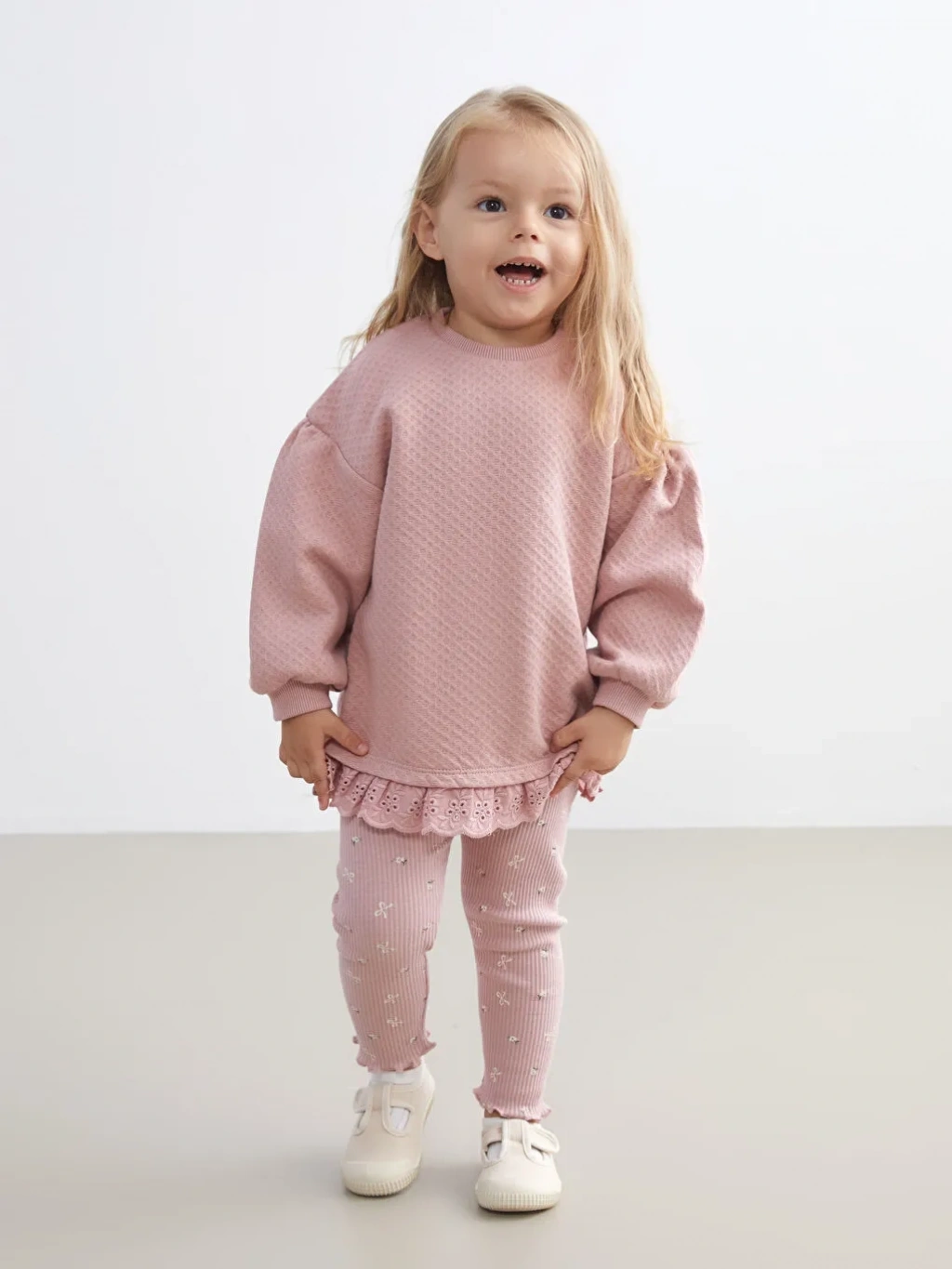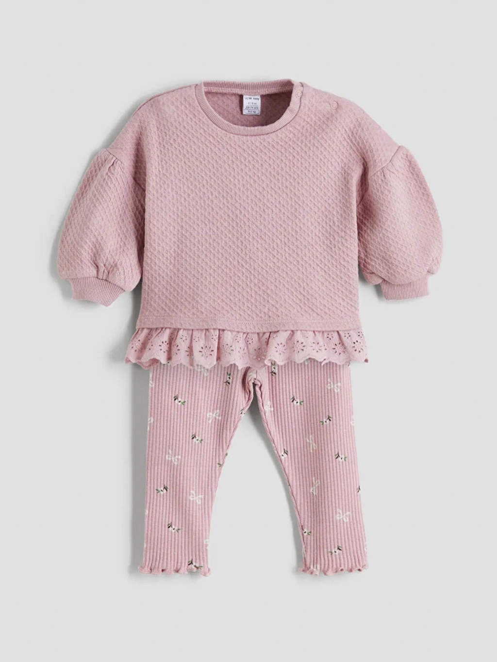Yüksek pamuk içerikli kız bebek takım; omuzdan çıtçıtlı, bisiklet yaka, uzun balon kollu, etek ucu fırfırlı sweatshirt ve desenli tayttan oluşur.