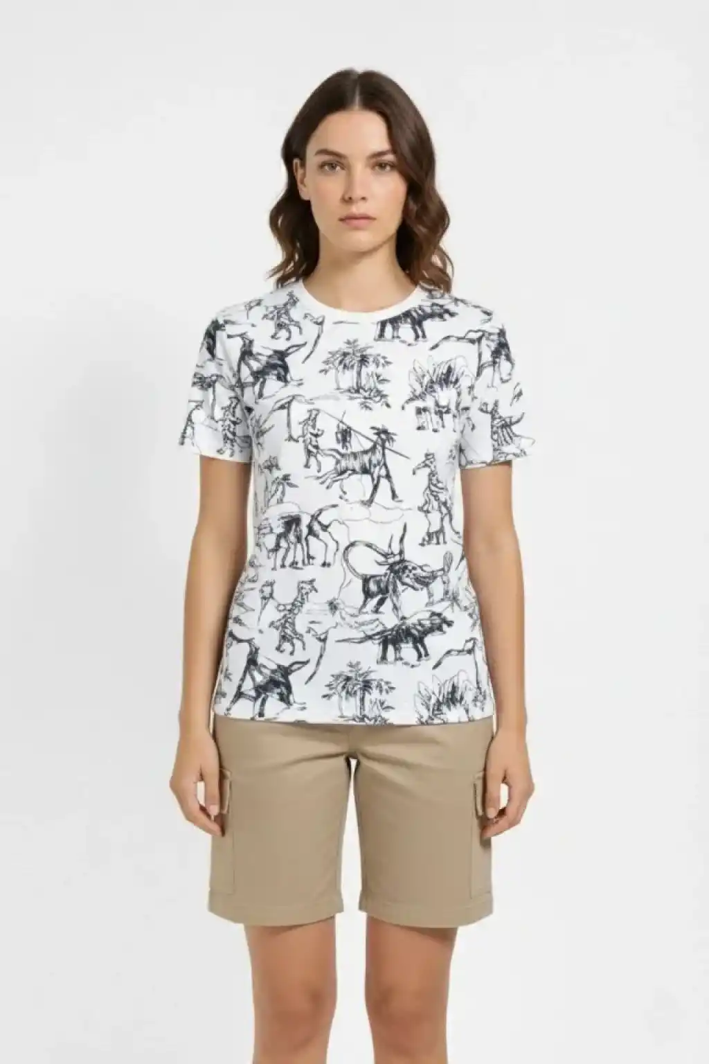 Beyaz Dinozor Desenli Tişört – Regular Kalıp, Bisiklet Yaka, Dijital Baskılı Pamuklu T-Shirt - Beyaz