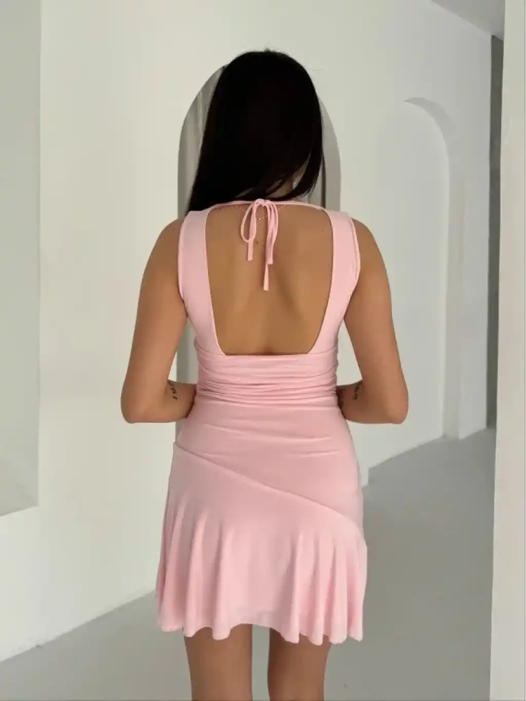 Derin V Yaka Sırt Dekolteli Mini Elbise Drapeli Şık Kolsuz - Pembe