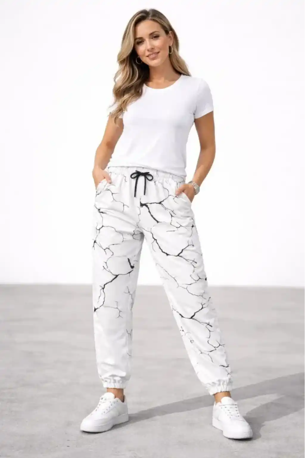 Dijital Baskılı Eşofman Altı Kışlık Üç İplik Şardonlu Kumaş Lastikli Paça, Cepli, Rahat Kalıp - Beyaz