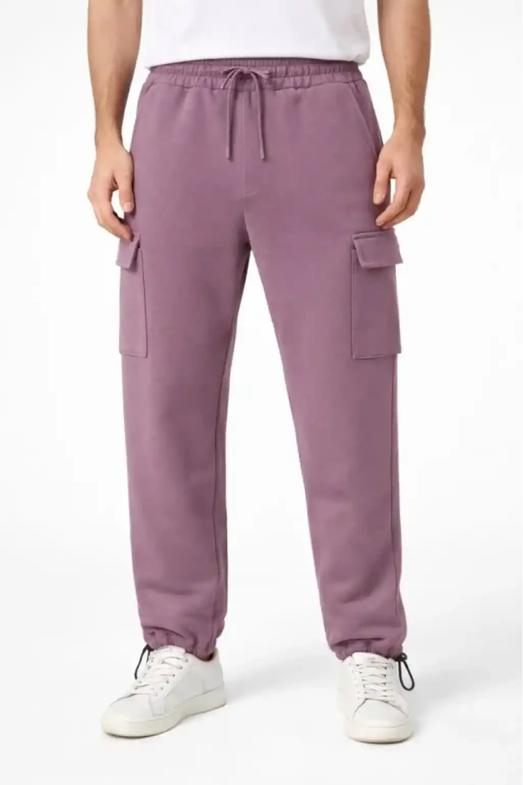Erkek Baggy Üç İplik Kargo Cepli Eşofman Ayarlanabilir Paça Beli İpli Pantolon - Gül Kurusu
