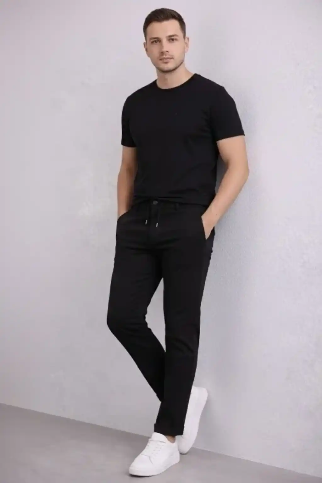 Erkek Diagonel Mikro Dokulu Duble Paça Cepli Pantolon Bağcıklı Bel, Modern Kesim - Siyah
