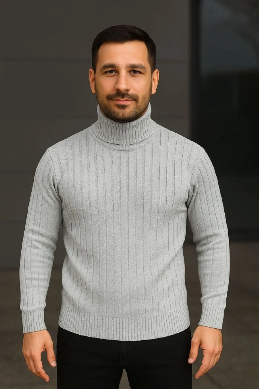 Erkek Fitilli Triko Kazak 2li Set Gri Siyah Regular Balıkcı Yaka Tam Boğazlı Triko Seti Modeli Kazak