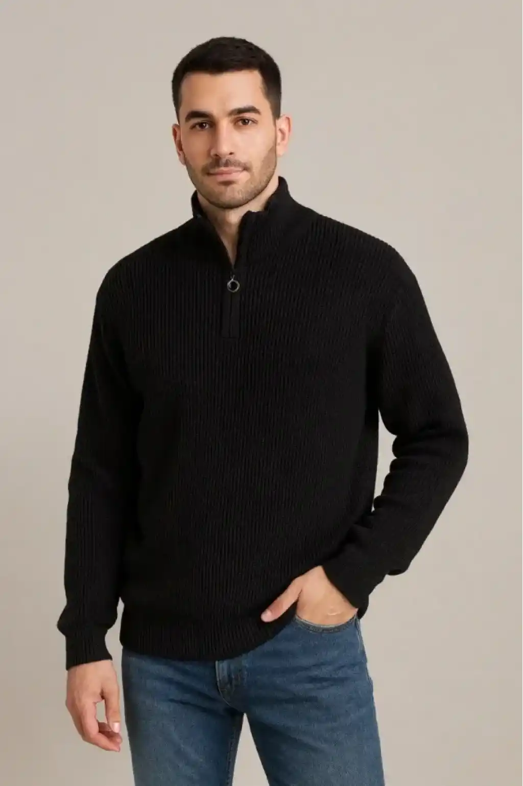 Erkek Fitilli Triko Kazak 2’li Set – Siyah - Bej Kalın Dokuma Pamuklu Regular Fit V Yaka Fermuarlı Uzun Kollu Rahat Kışlık Kazak Kombini