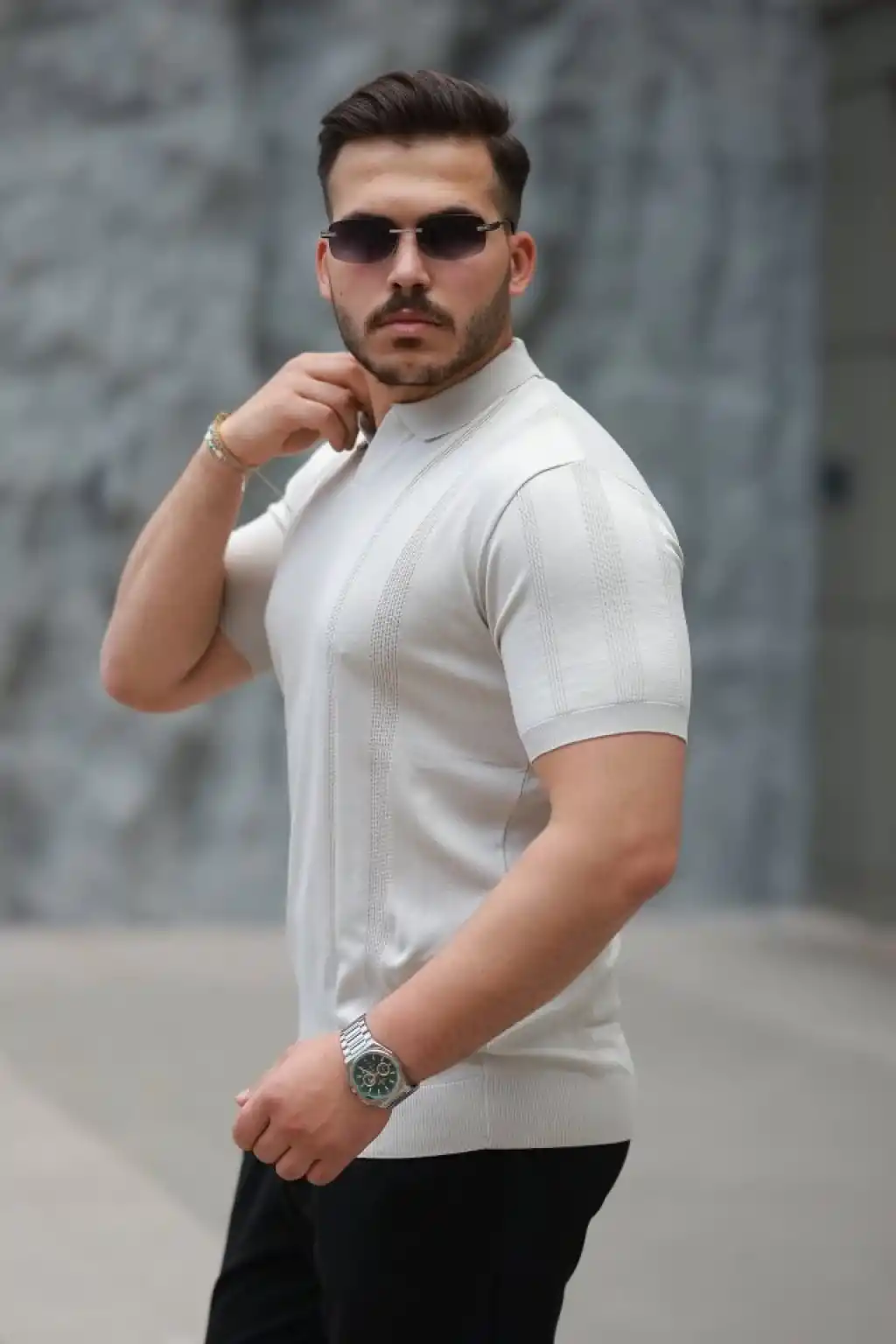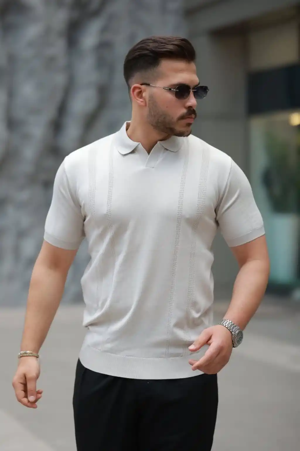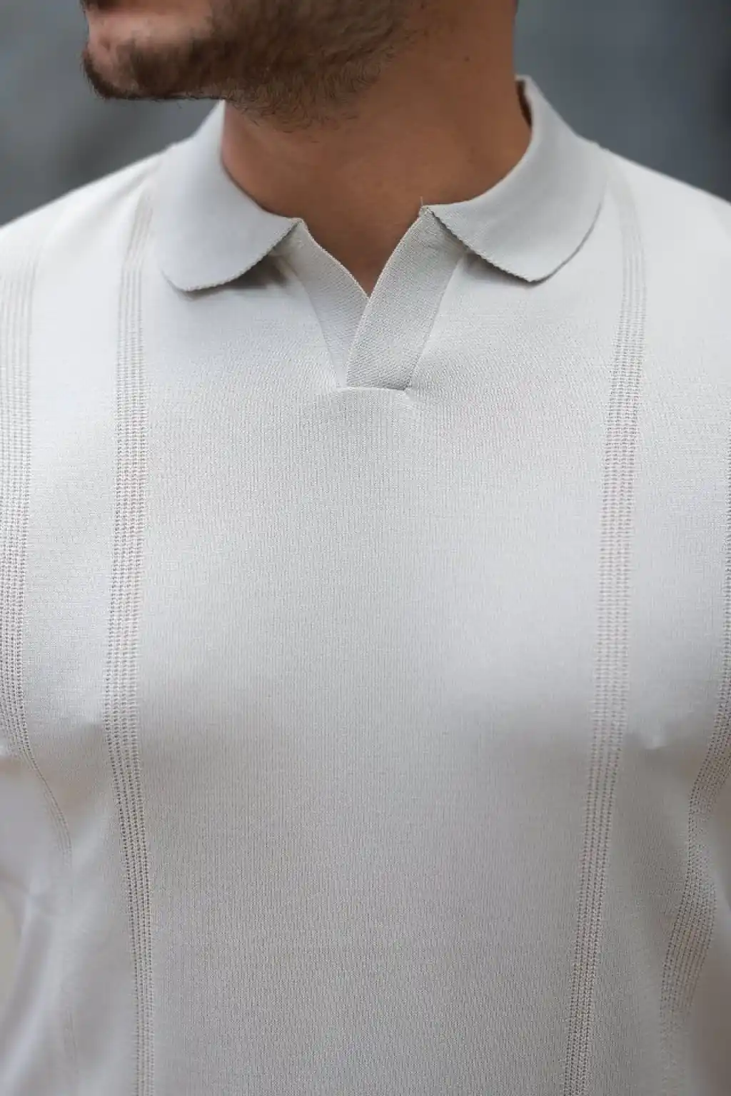 Erkek Dikey Kabartmalı Örgü Dokulu Fermuar Yakalı Tişört