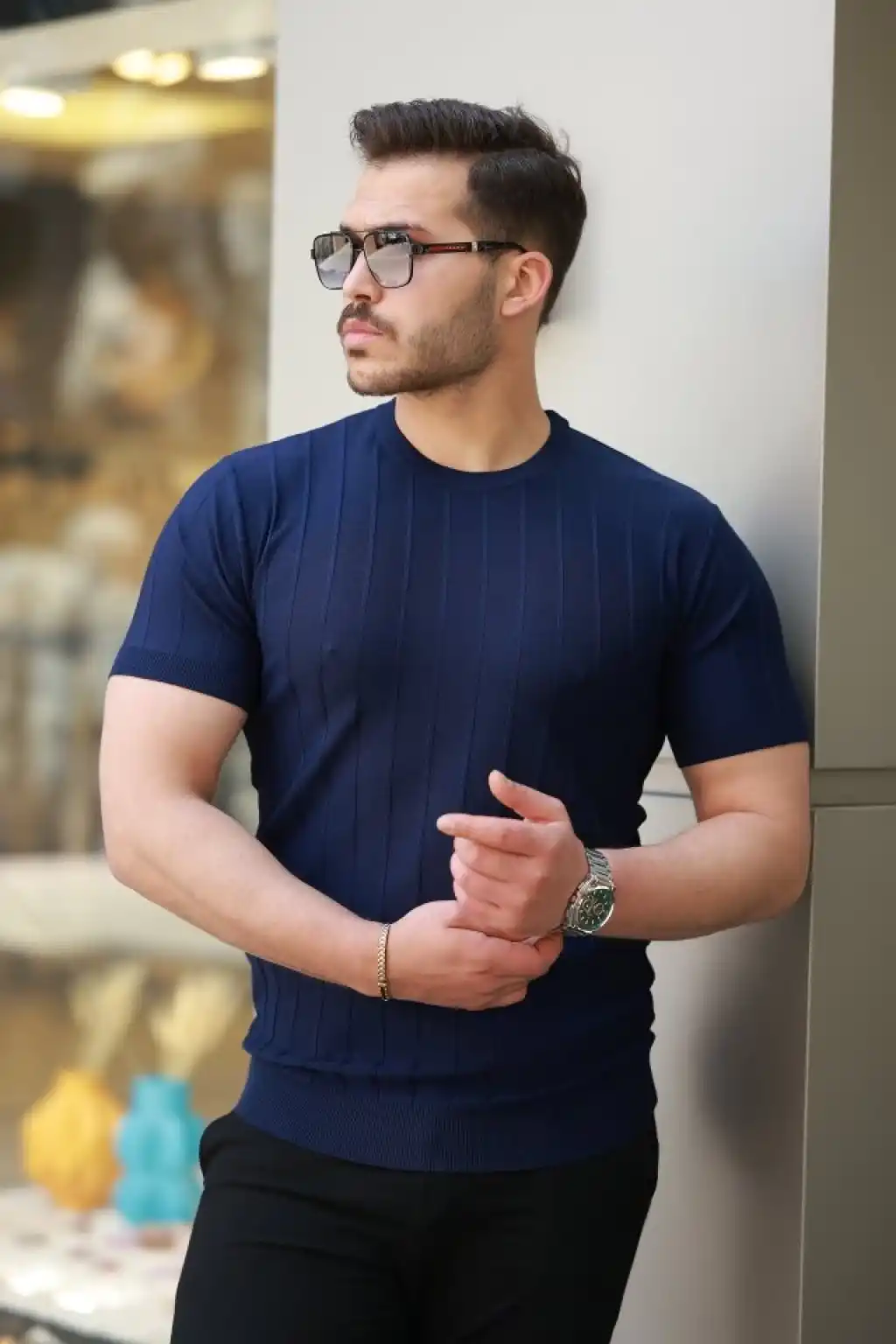 Erkek Kısa Kollu Bisiklet Yaka çizgili Triko Tişört