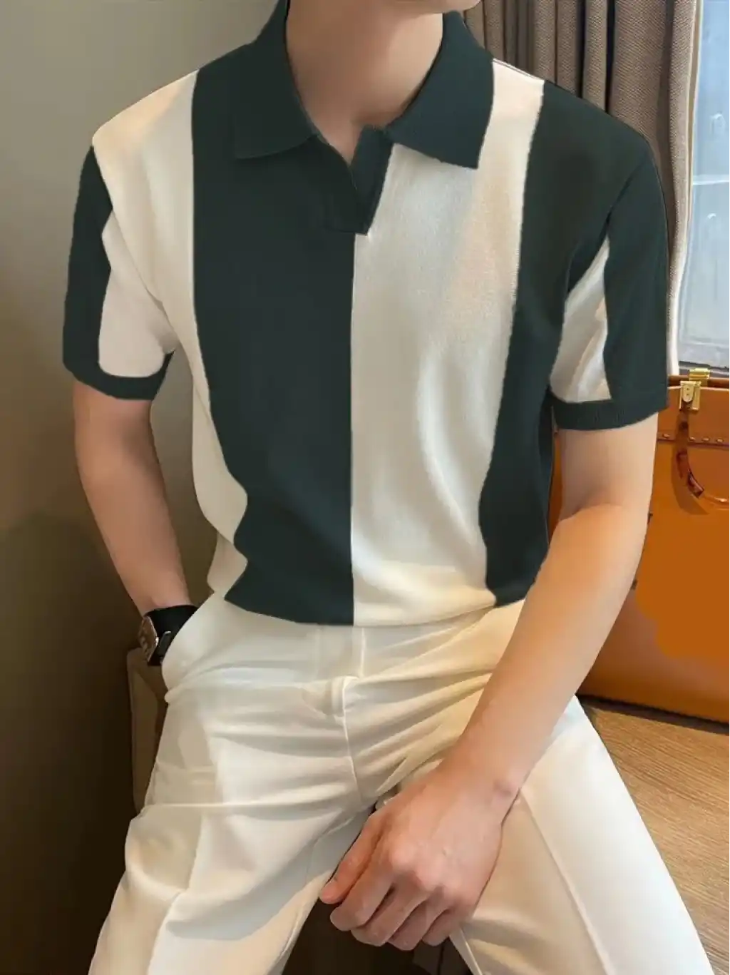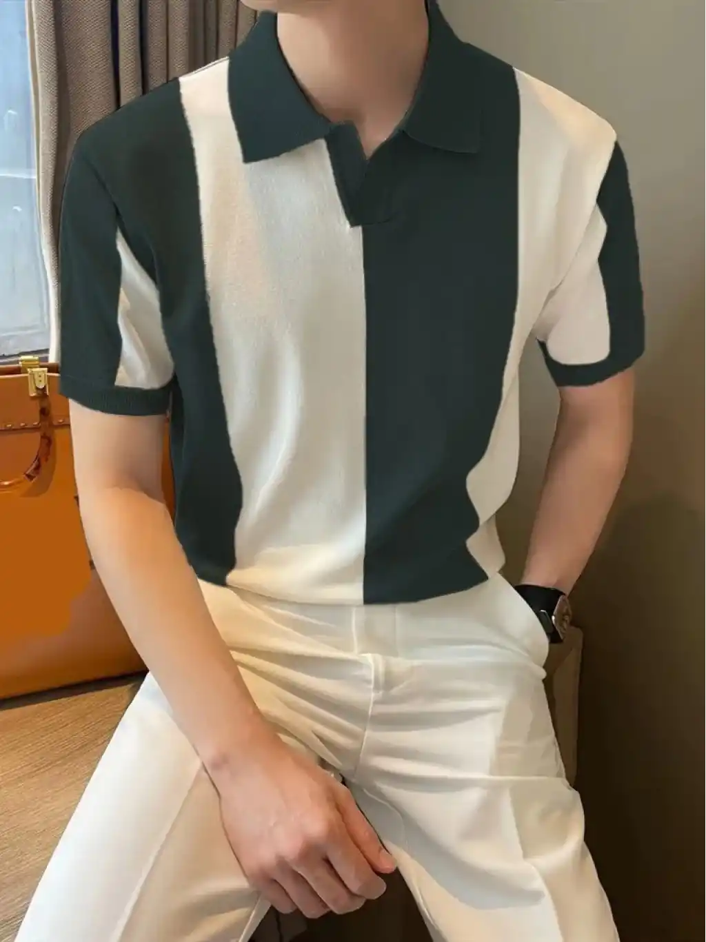 Erkek Kısa Kollu Polo Yakalı Blok Desenli Triko Tişört