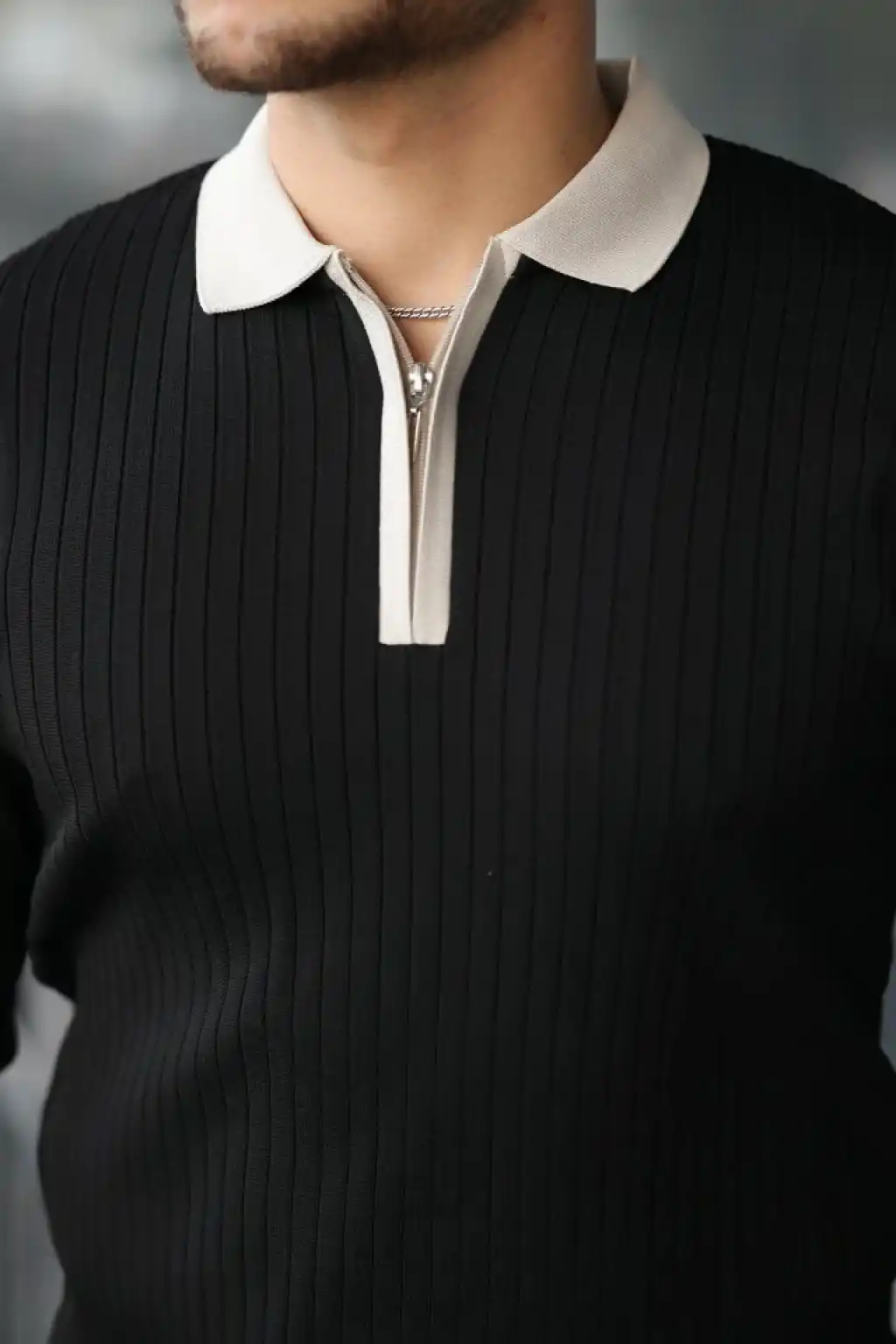 Erkek Fermuarlı Bisiklet Yaka Dokulu Uzun Kollu Triko