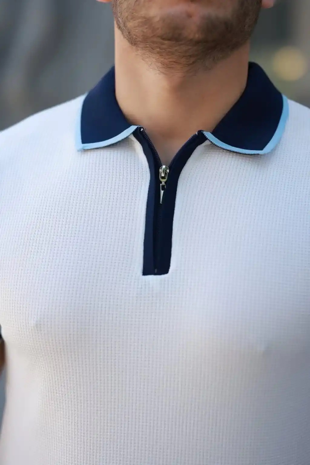 Erkek Dikey Kabartmalı Örgü Dokulu Fermuar Yakalı Tişört