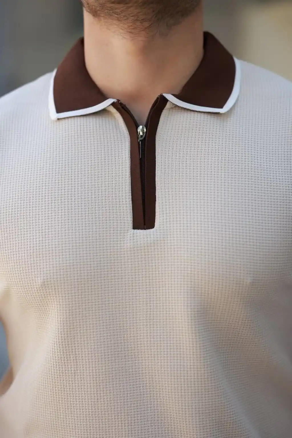 Erkek Dikey Kabartmalı Örgü Dokulu Fermuar Yakalı Tişört