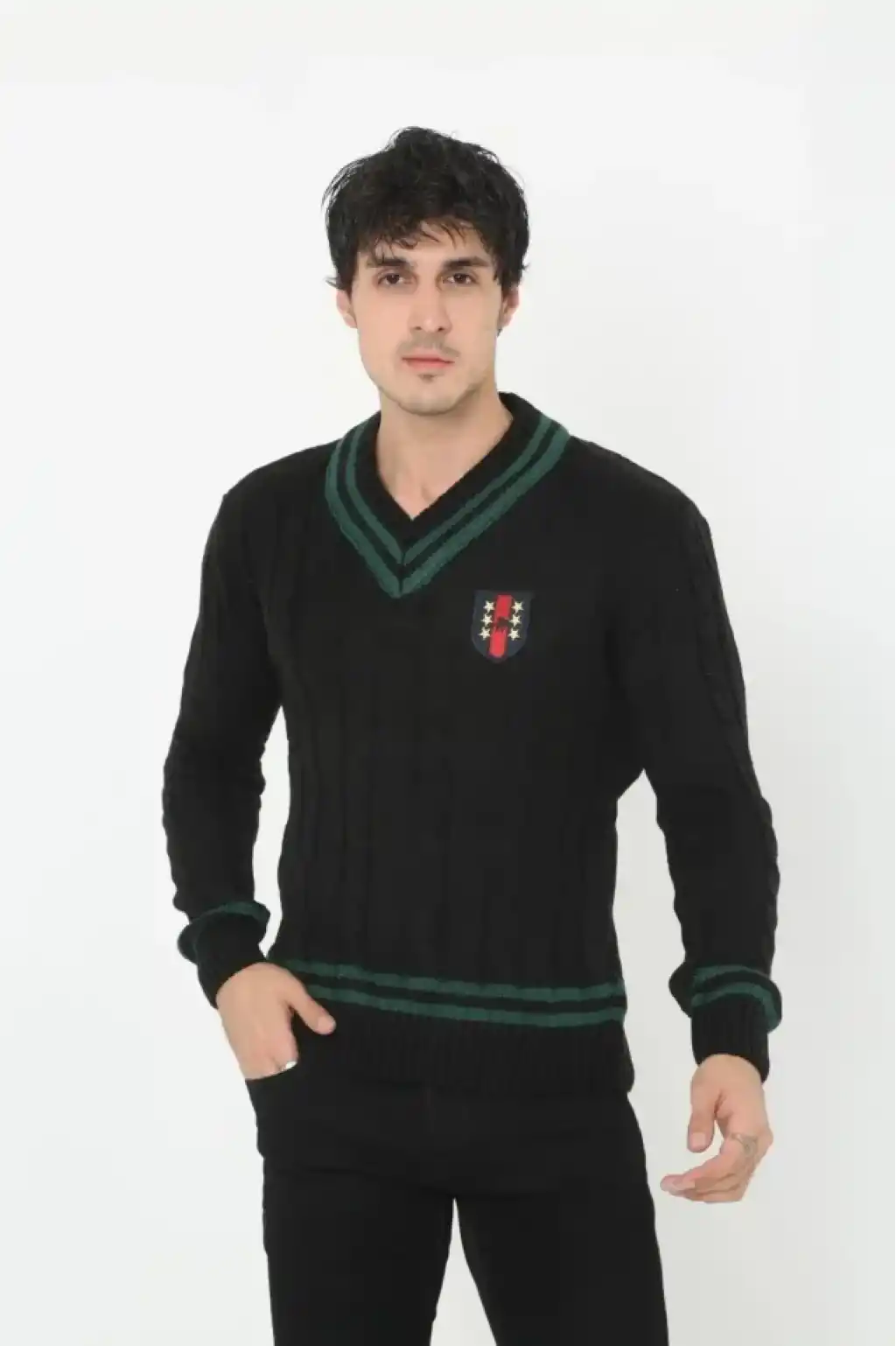 Erkek Fitilli Triko Kazak 2’li Set – Siyah - Haki Kalın Dokuma Pamuklu Regular Fit V Yaka Fermuarlı Uzun Kollu Rahat Kışlık Kazak Kombini