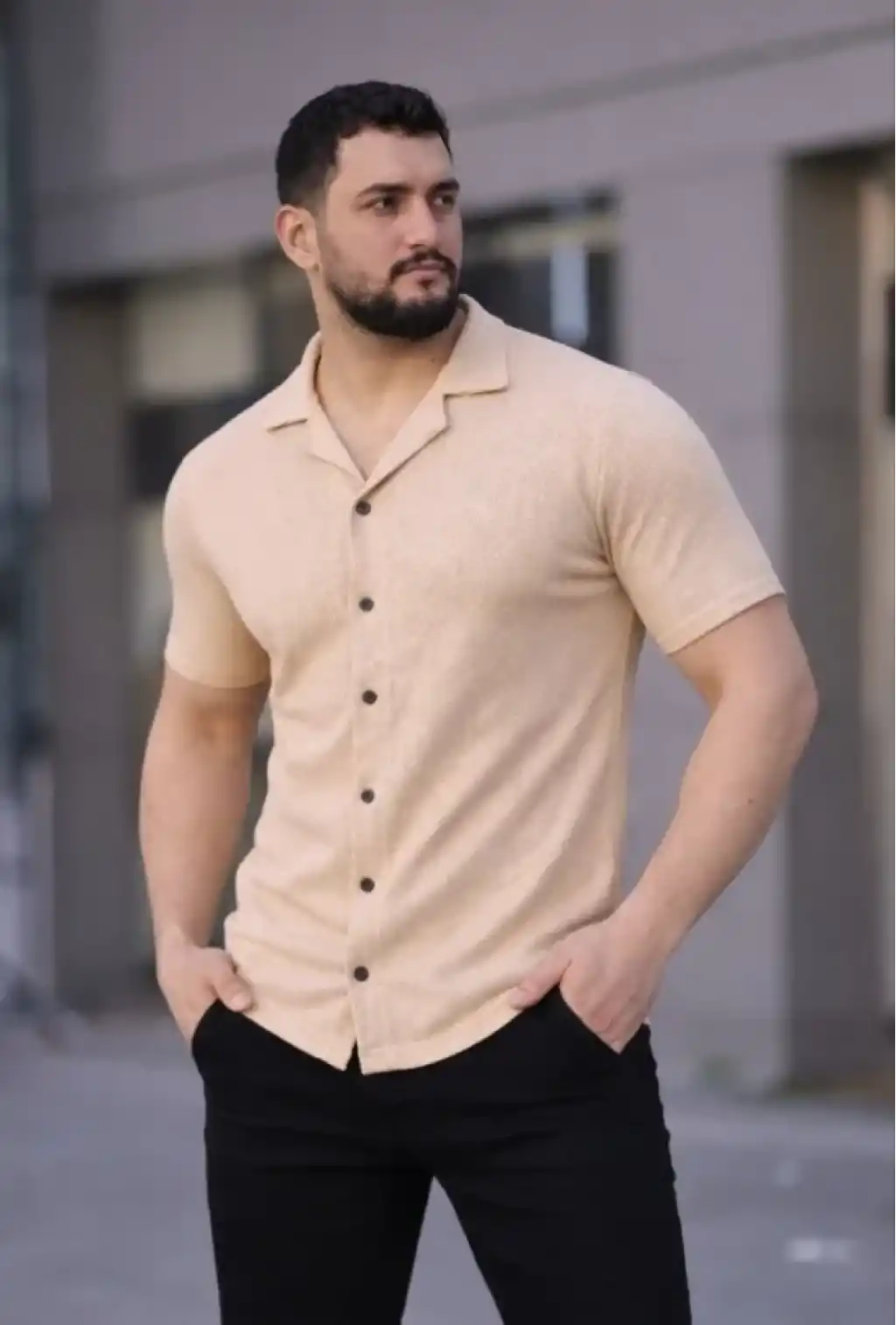 Erkek Waffle Kumaş Kısa Kollu Gömlek Şort Takım Regular Fit Yazlık İkili Set - Bej