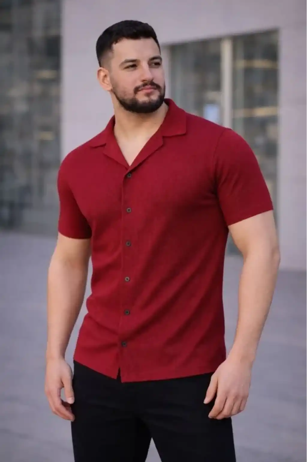 Erkek Waffle Kumaş Kısa Kollu Düğmeli Açık Yaka Regular Fit Gömlek - Kırmızı