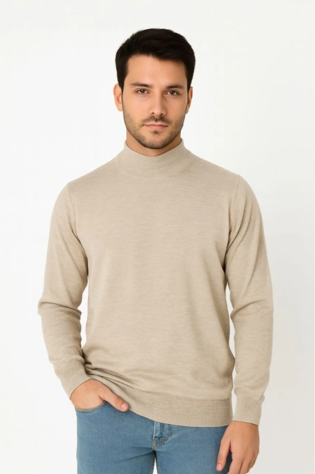 Erkek Yarım Boğaz Triko Kazak Yumuşak Dokulu Pamuklu Ince Dokuma, Uzun Kollu Rahat Regular Kalıp - Bej