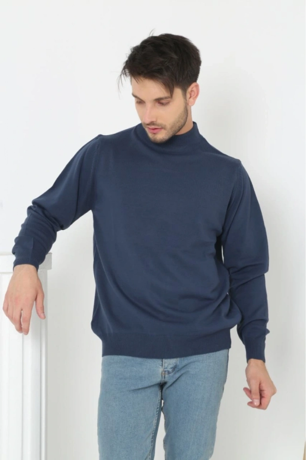 Erkek Yarım Boğaz Triko Kazak Yumuşak Dokulu Pamuklu Ince Dokuma, Uzun Kollu Rahat Regular Kalıp - İndigo