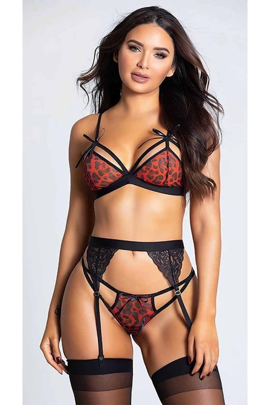 For Dreams 8356 Kırmızı Leopar Desenli Jartiyer Takım