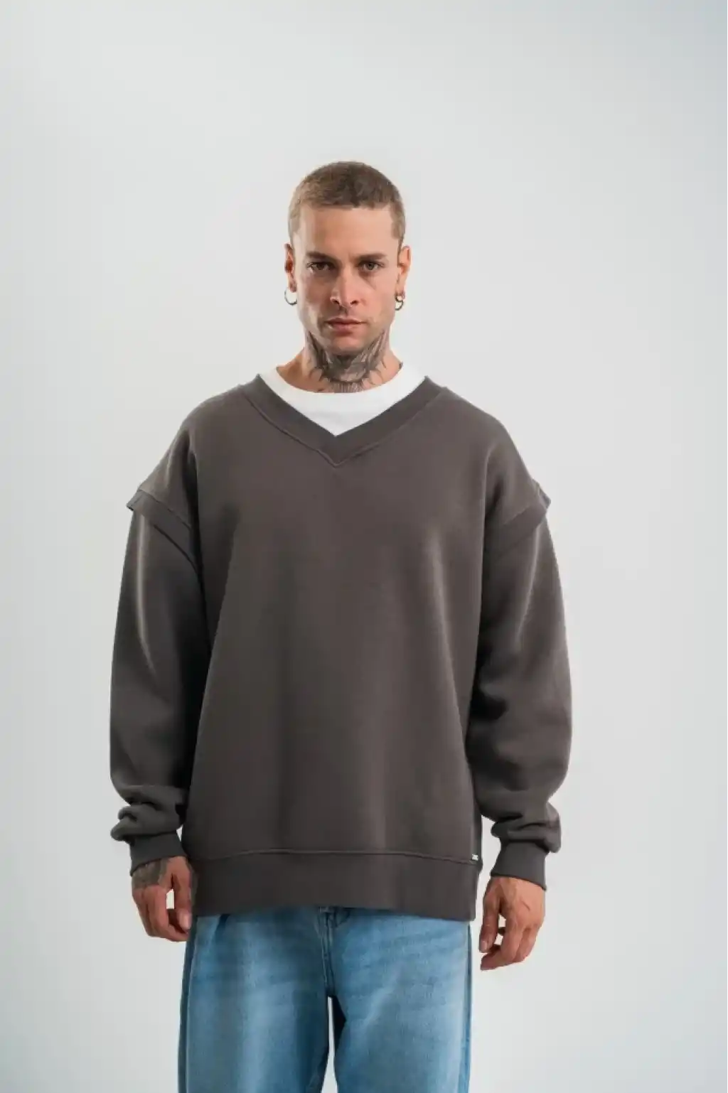 Geniş V Yaka Kol Ribana Detaylı SweatShirt - Füme