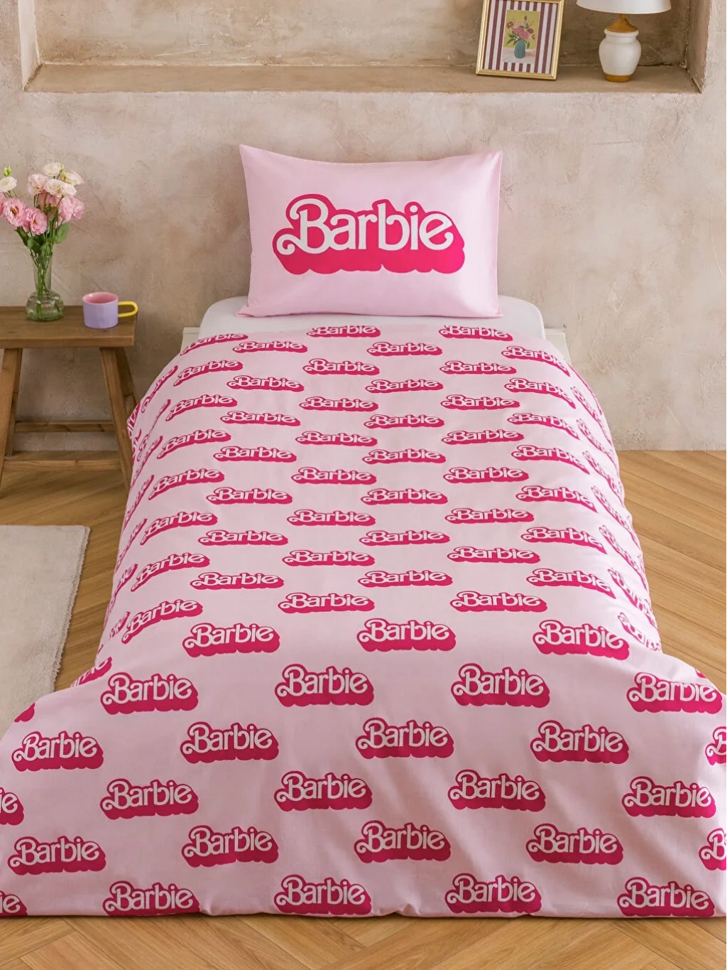 HOME Pembe Barbie Baskılı Tek Kişilik Nevresim Seti 160x220/50x70 cm