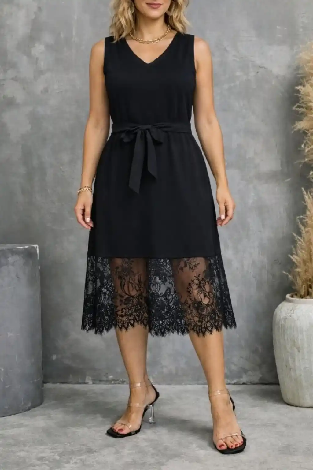Kadın Askılı V Yakalı Dantelli Midi Viskon Elbise