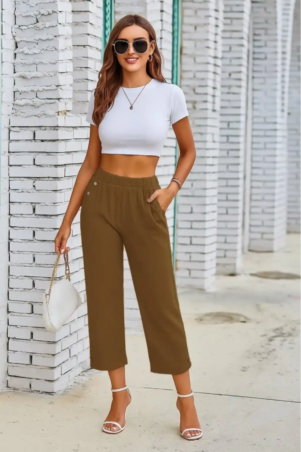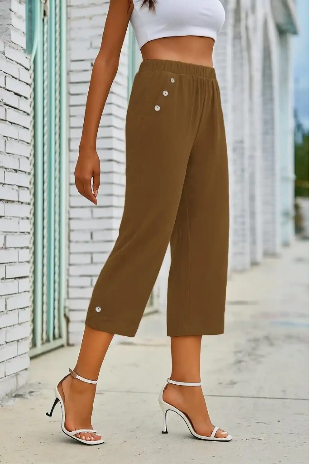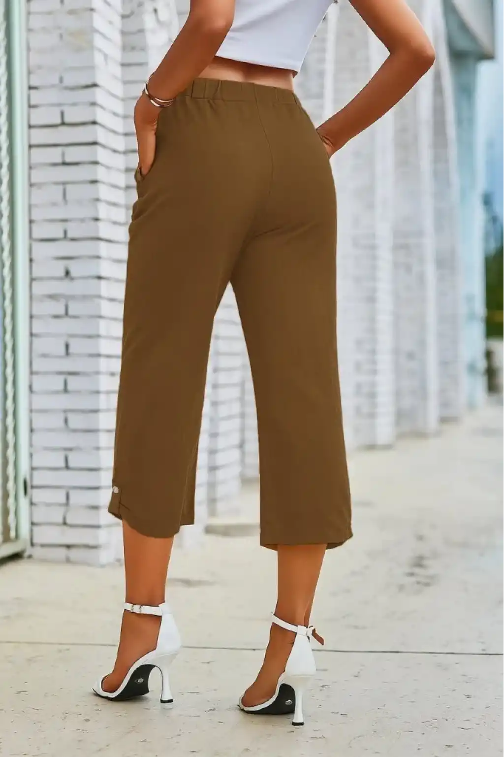 Kadın Beli Lastikli Düğme Ve Cep Detaylı Kapri Ithal Keten Pantolon