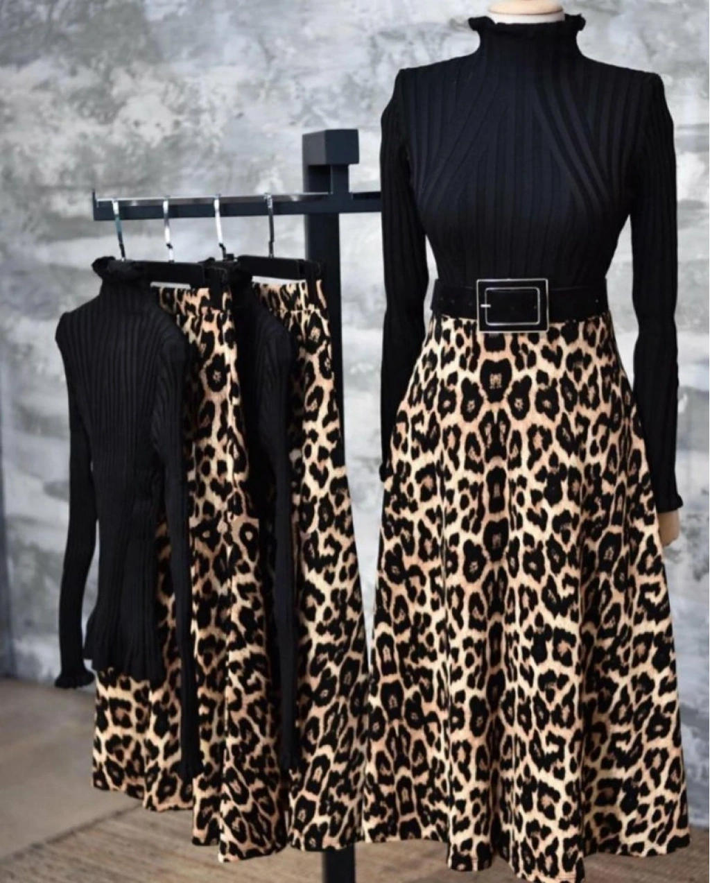 Kadın Beli Lastikli Leopar Desenli Krep Kumaş Efsane Etek Kemersiz