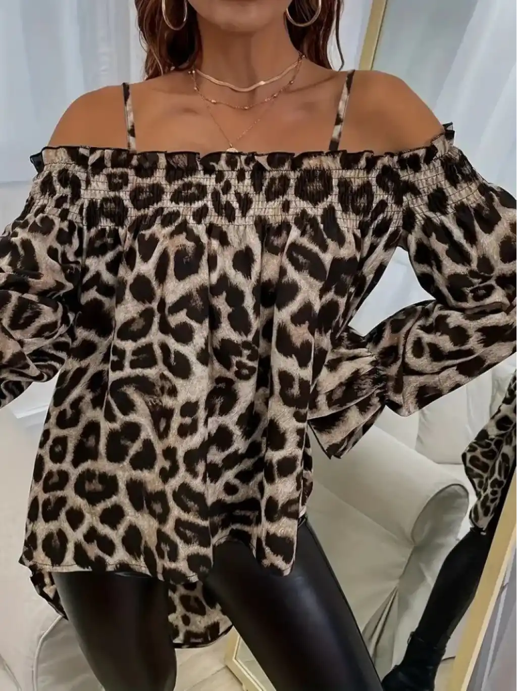 Kadın Ip Askılı Omuzlardan Açık Leopar Desenli Asimetrik Kesim Süprem Bluz