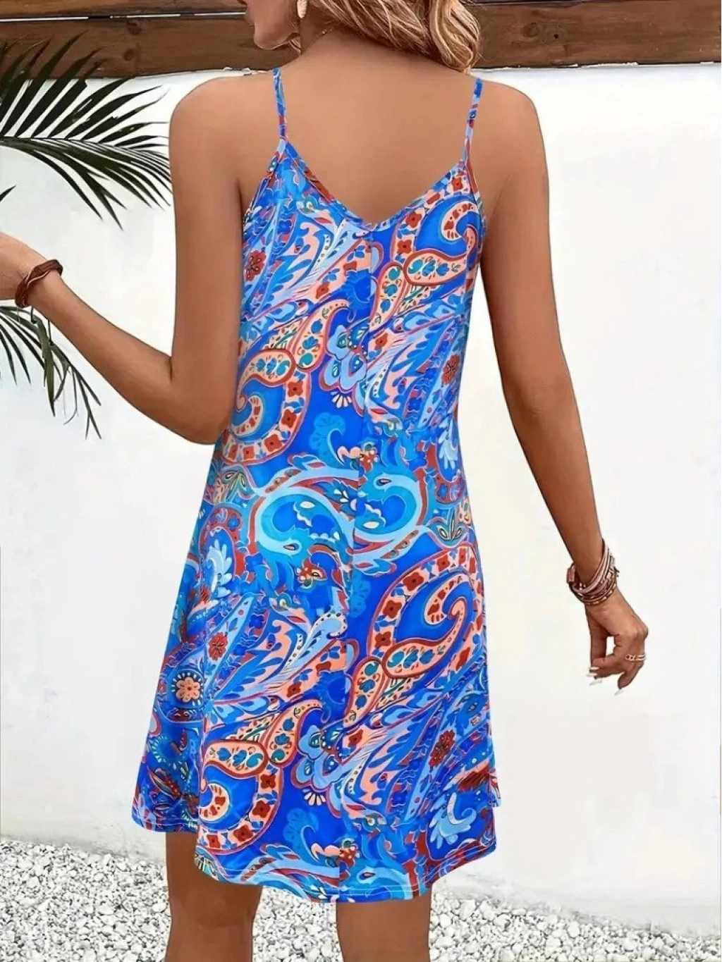 Kadın Ip Askılı V Yakalı Desenli Kısa Süprem Mini Elbise