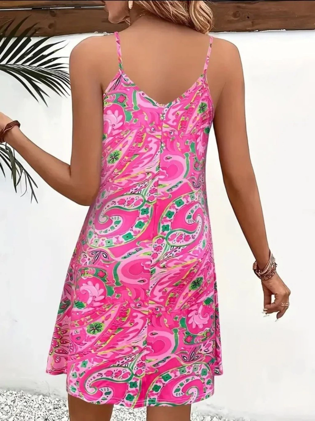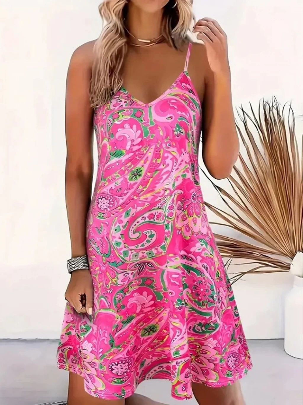 Kadın Ip Askılı V Yakalı Desenli Kısa Süprem Mini Elbise
