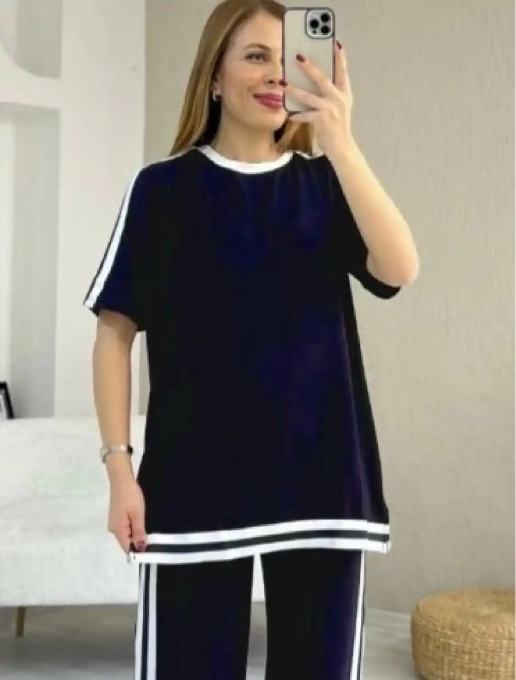 Kadın Kısa Kollu Bisiklet Yaka çift Renk şerit Detaylı Viskon Iki Iplik Bluz Ve Pantolon Ikili Takım