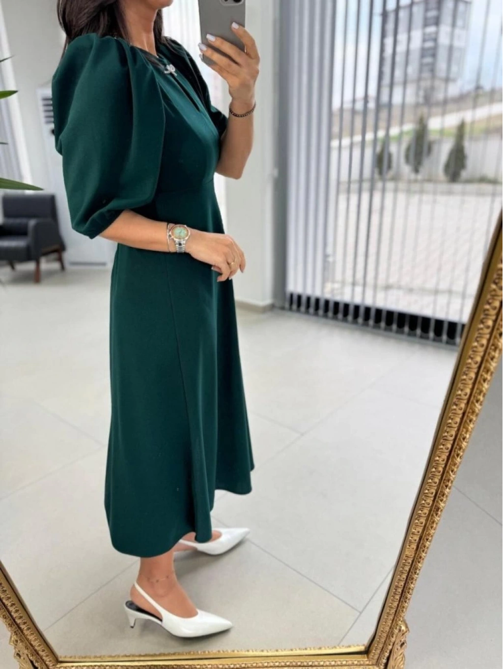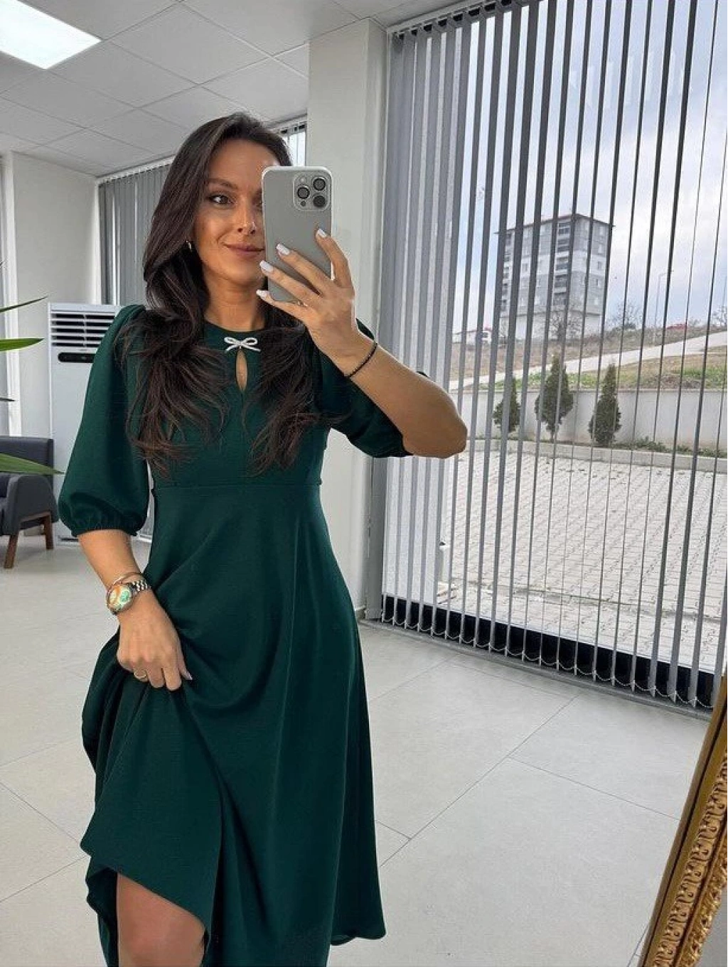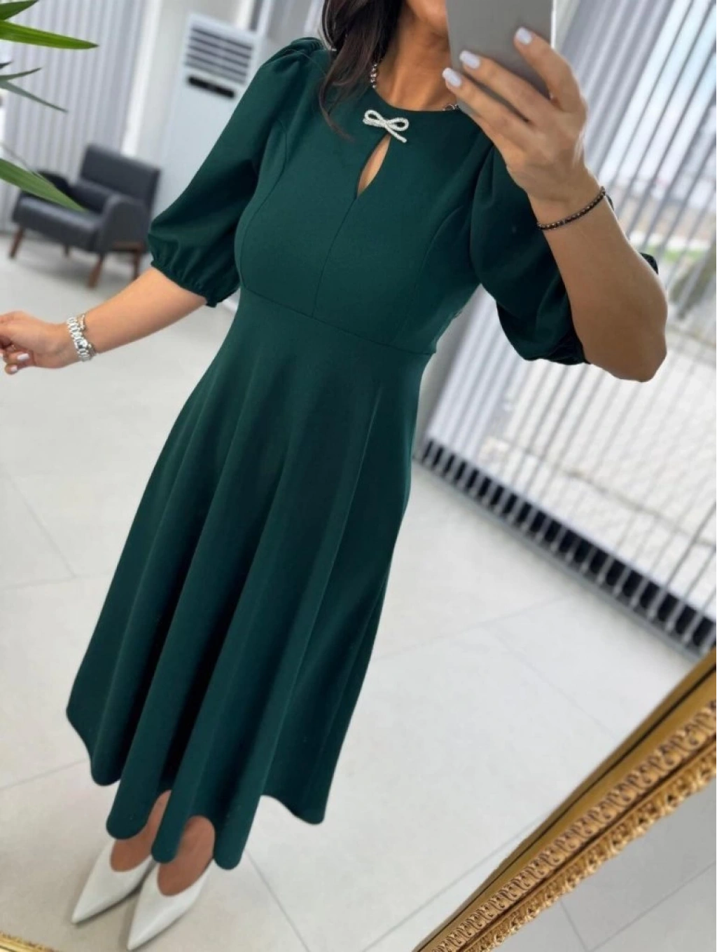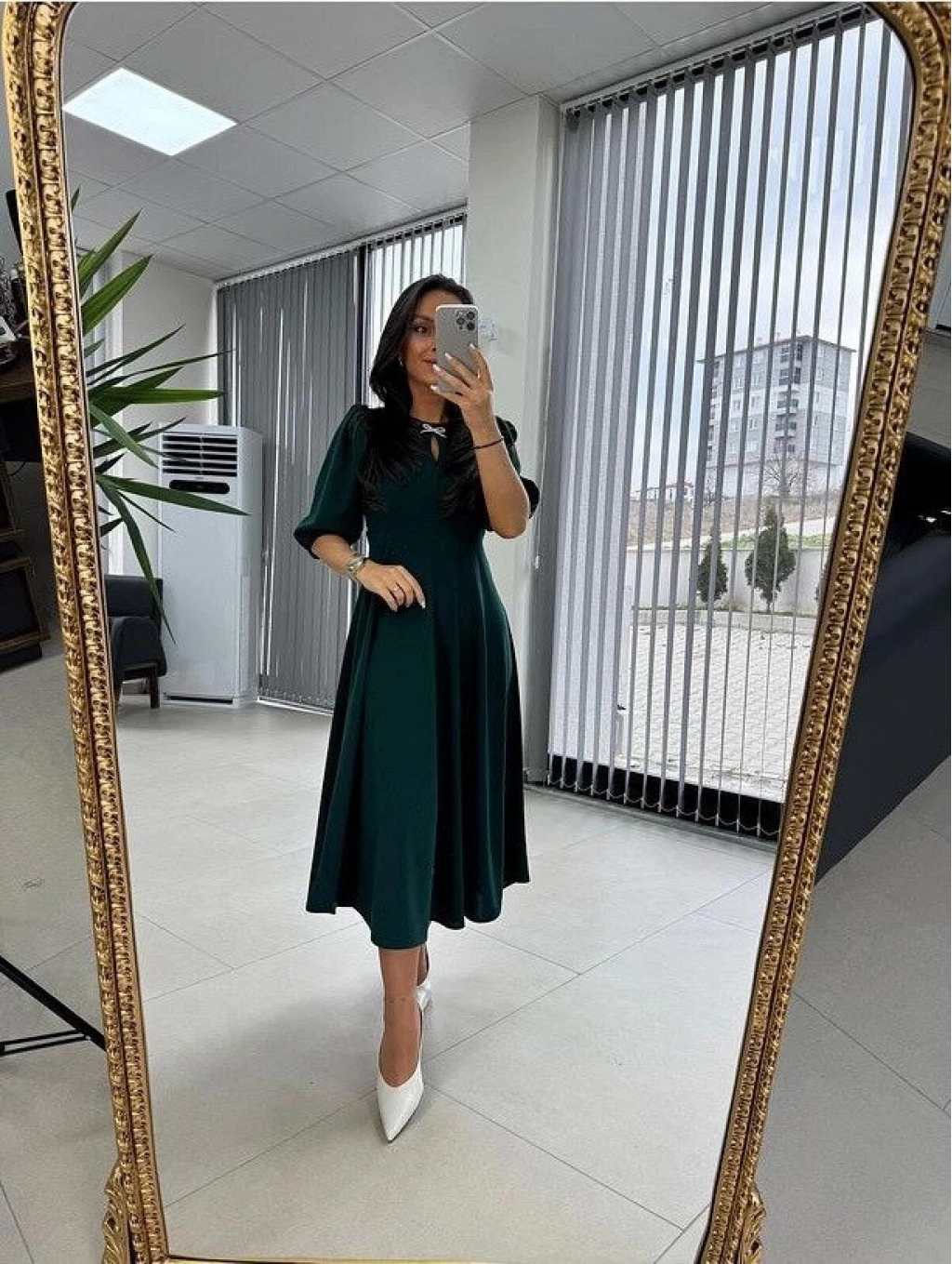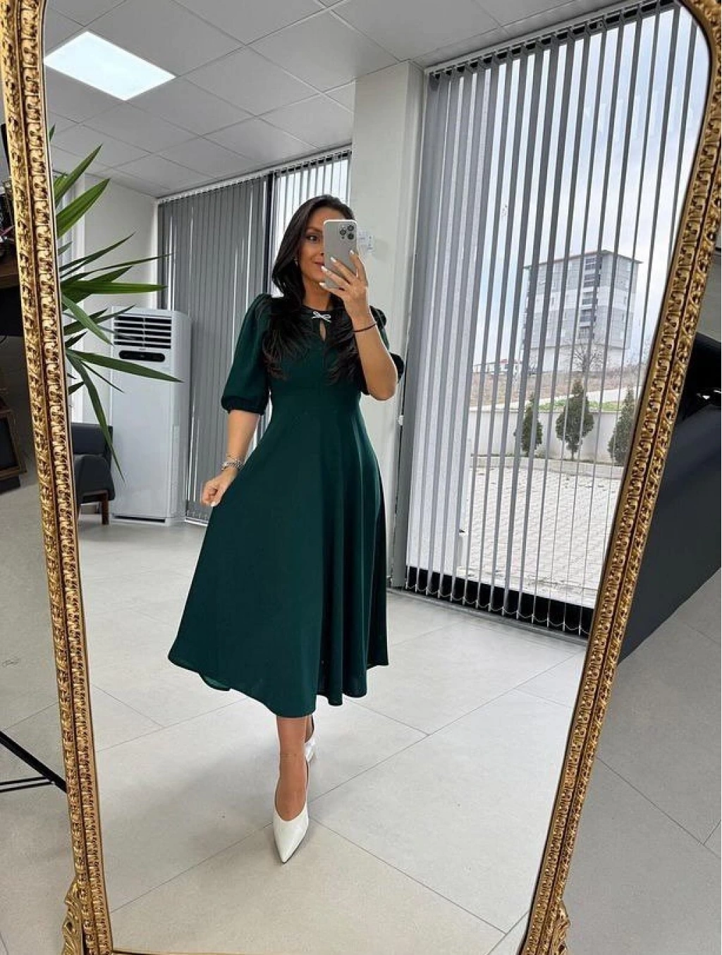 Kadın Kısa Kollu Bisiklet Yaka Fiyonk Broşlu Midi Janjan Krep Elbise
