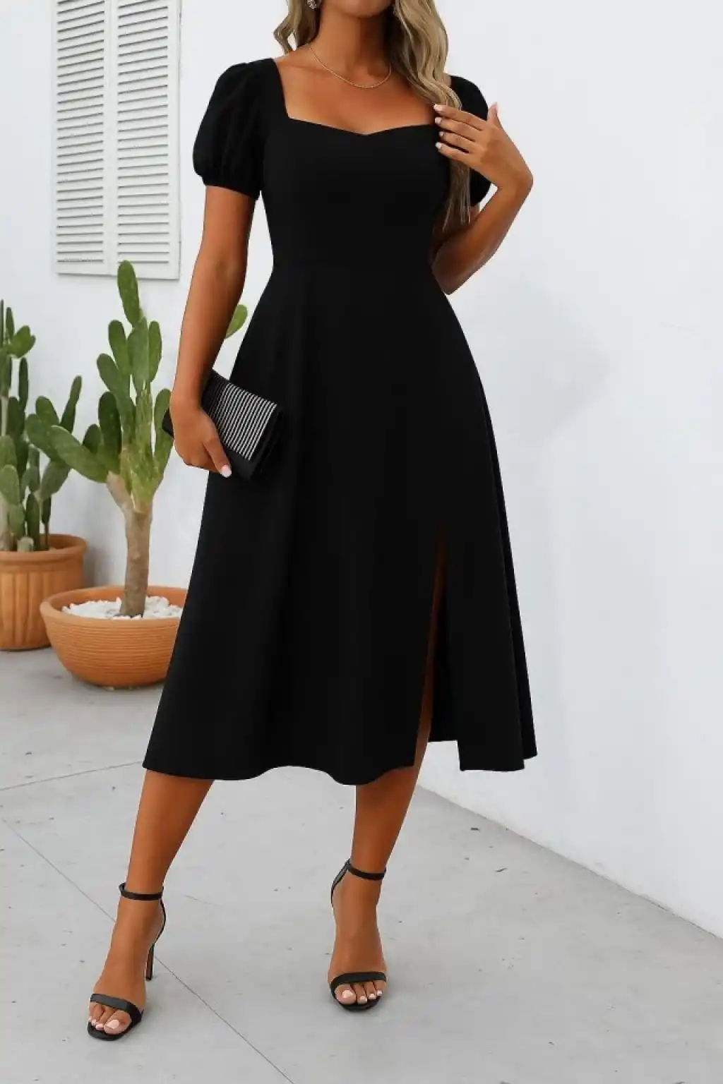 Kadın Kısa Kollu Kare Yakalı Yırtmaçlı Midi Janjan Krep Elbise