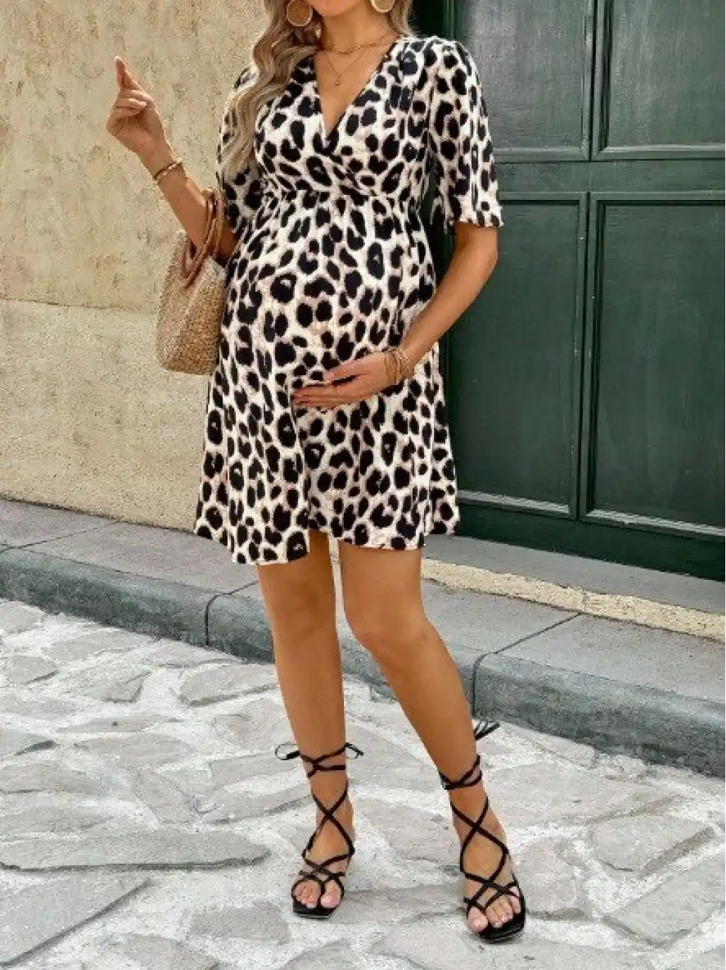 Kadın Kısa Kollu Kruvaze Yakalı Leopar Desenli Mini Süprem Elbise