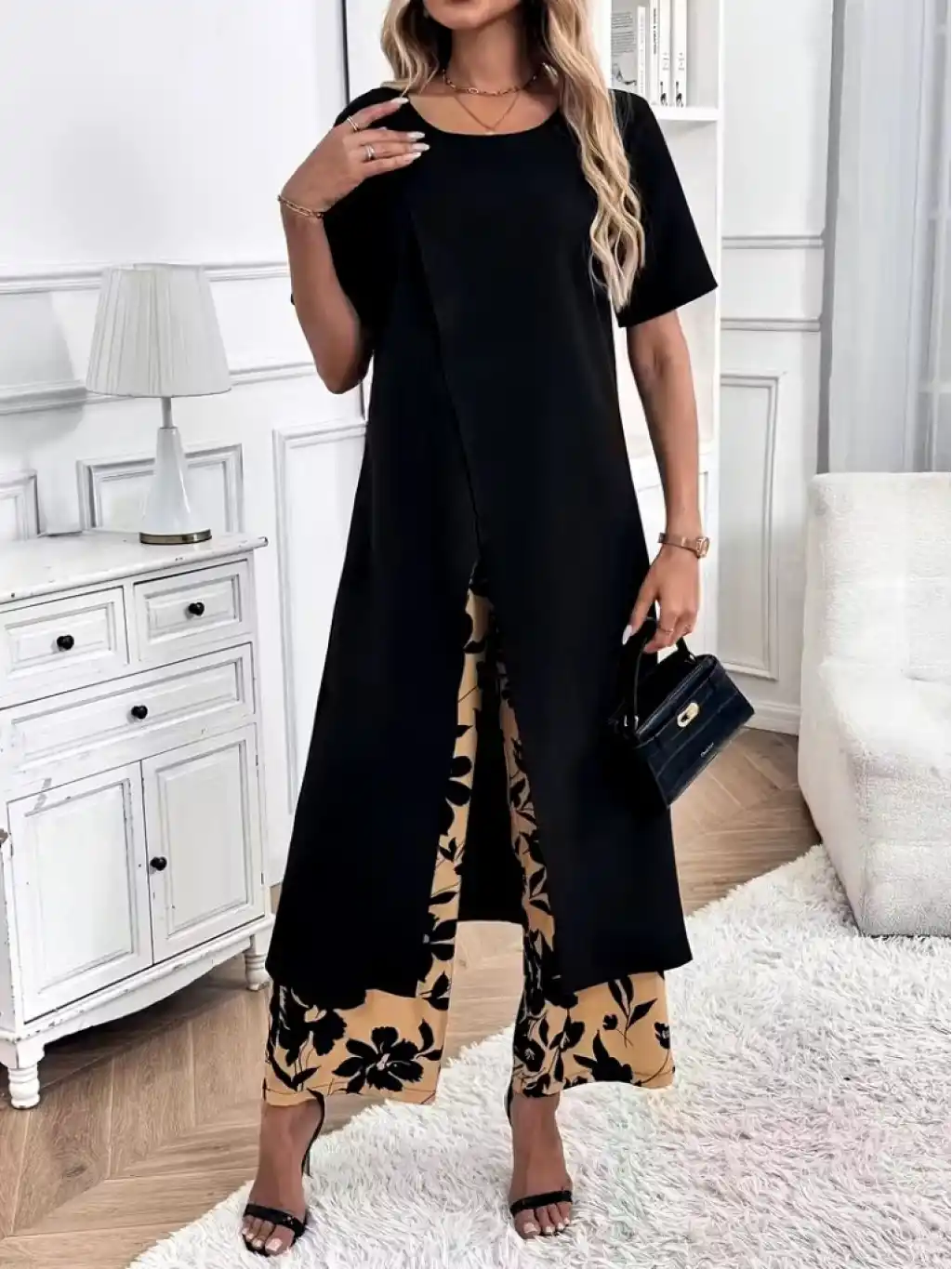 Kadın Kısa Kollu önden çapraz Detaylı Viskon Uzun Bluz Ve Desenli Iki Iplik Pantolon Ikili Takım