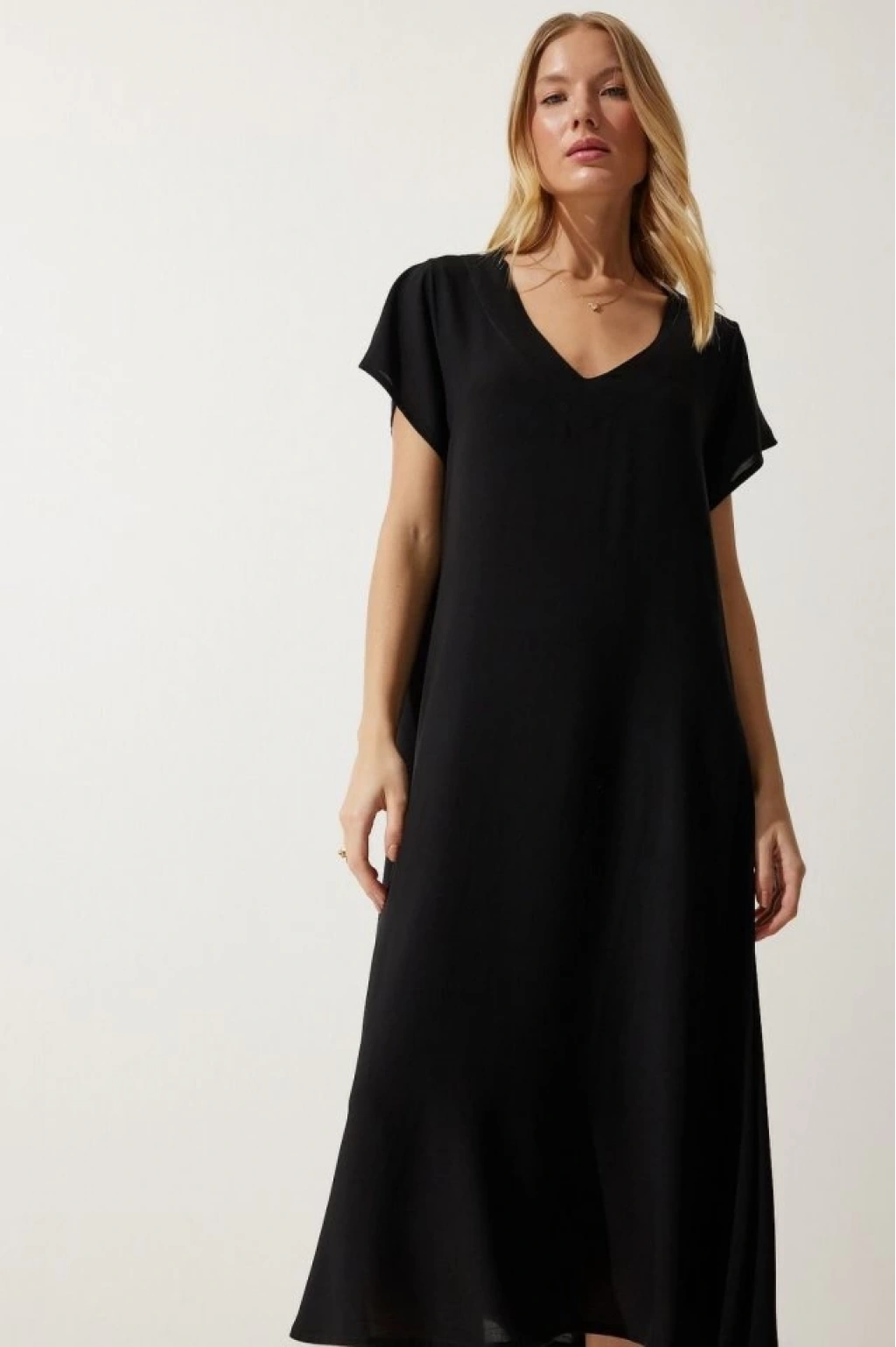 Kadın Kısa Kollu V Yaka Salaş Maxi Boy Elbise