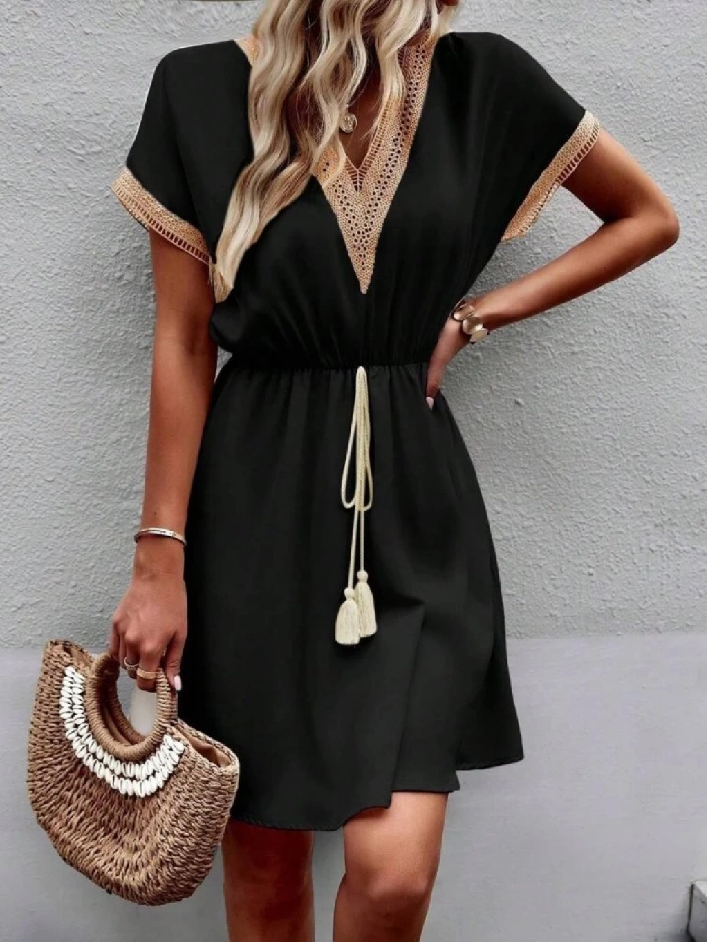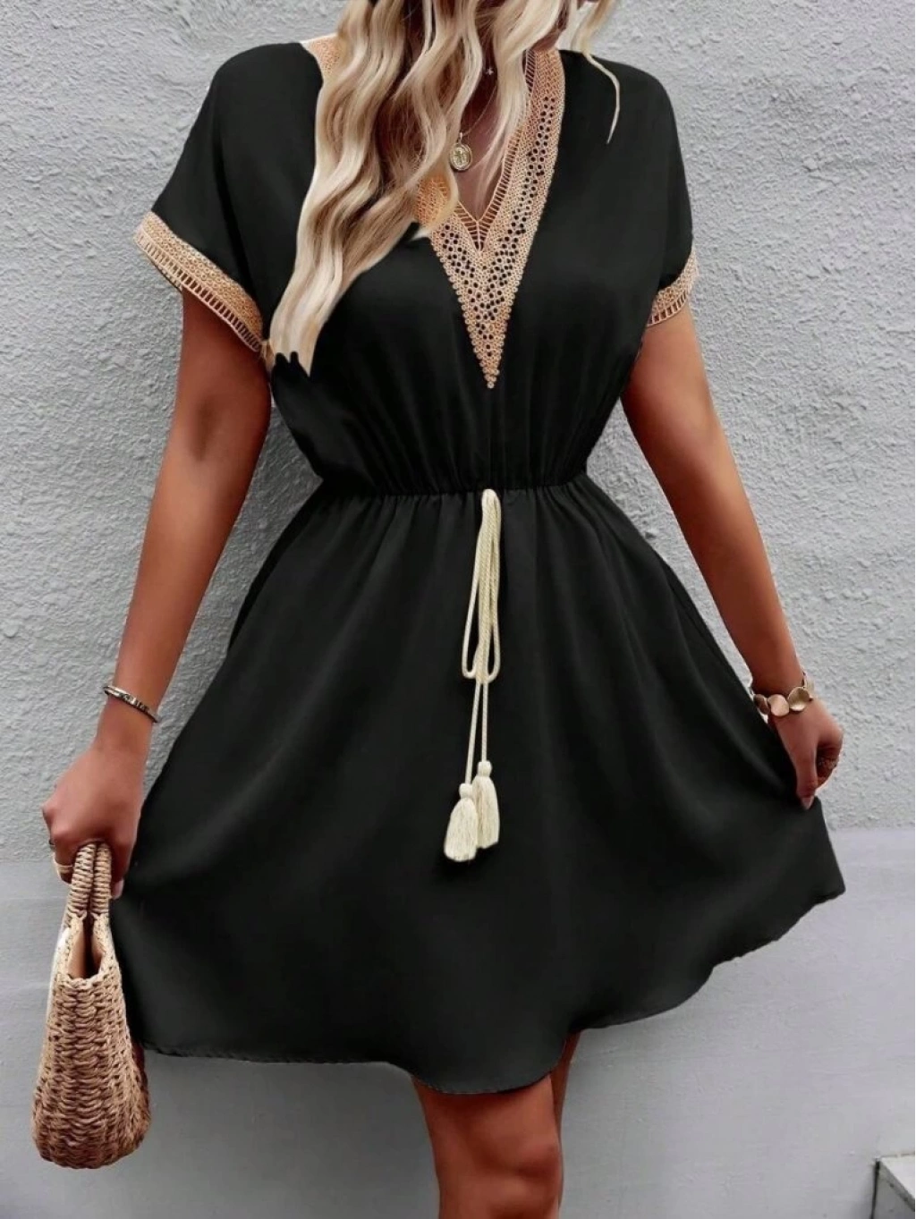 Kadın Kısa Kollu V Yakalı Belinde Bağcıklı Viskon Elbise