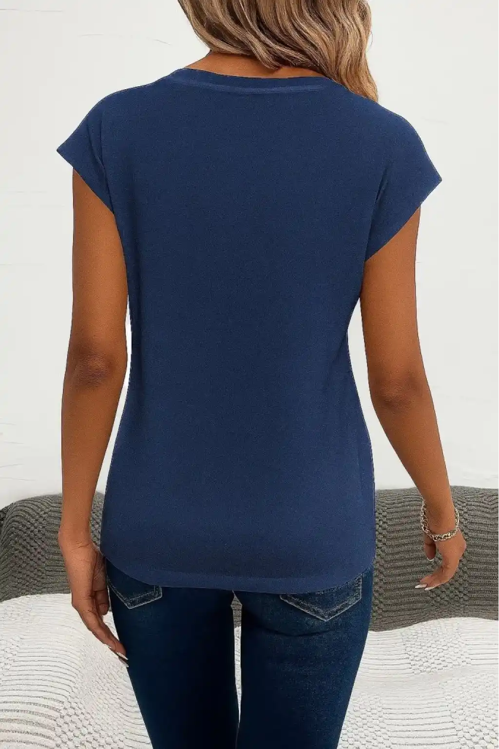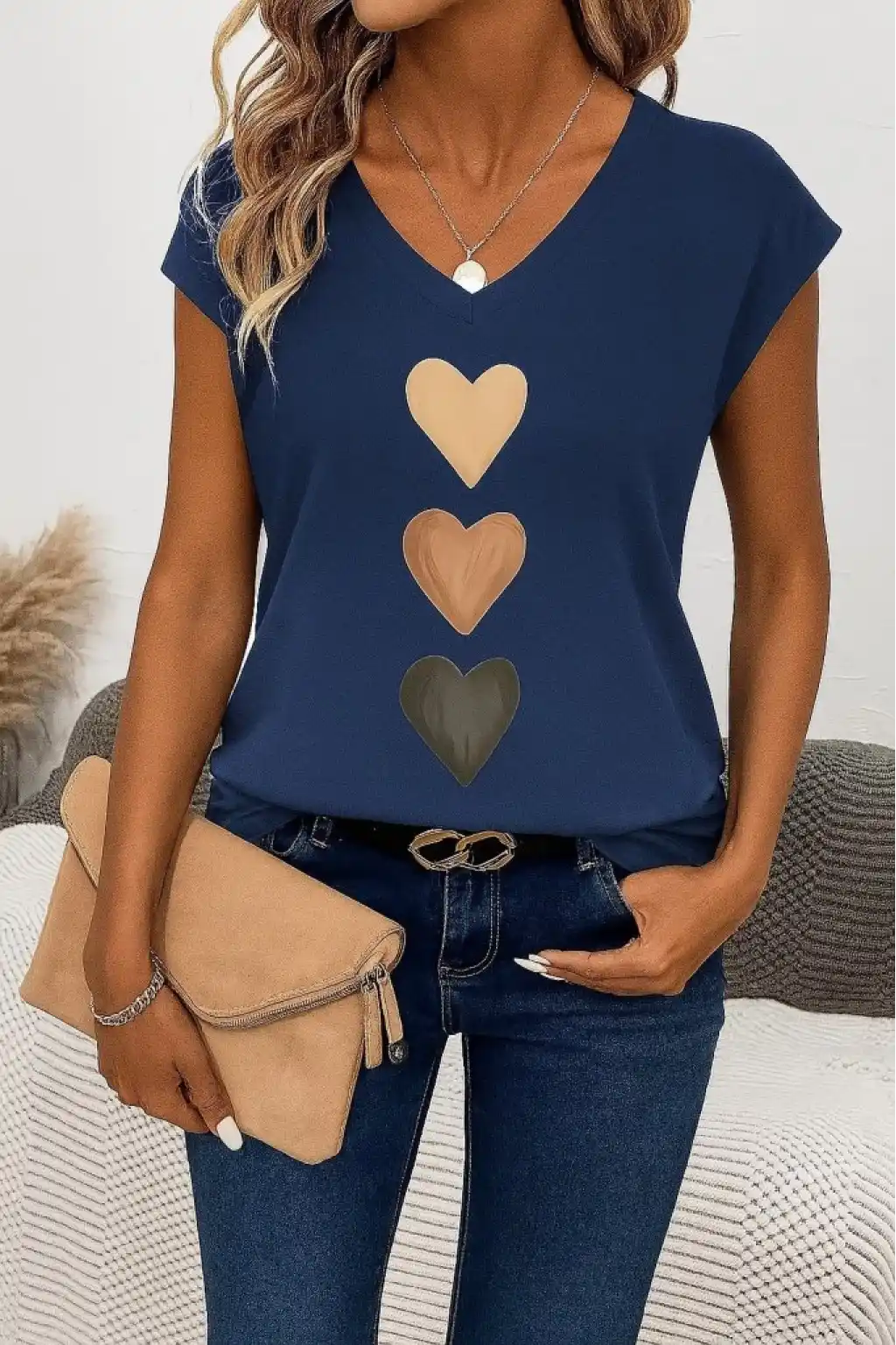 Kadın Kısa Kollu V Yakalı Kalp Desen Viskon Bluz