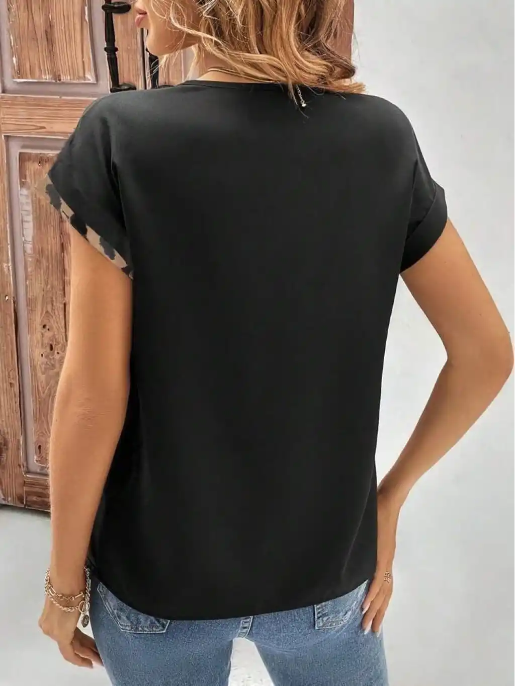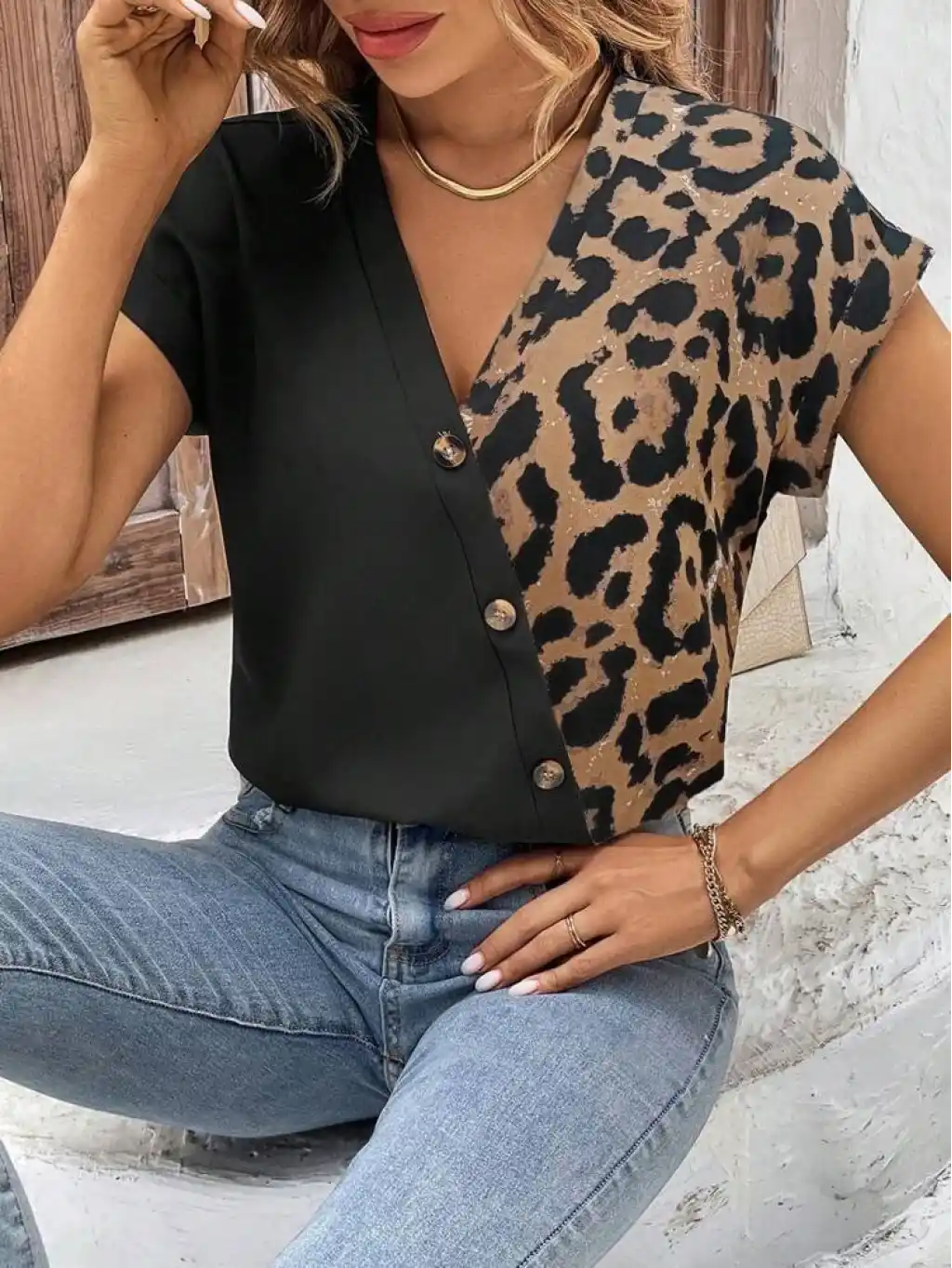 Kadın Kısa Kollu V Yakalı önden Düğmeli Leopar Desen Detaylı Viskon Bluz