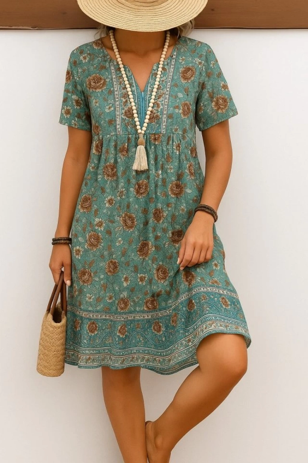 Kadın Kısa Kollu Yakası Bağcıklı önden Düğmeli Fırfır Desenli Süprem Elbise