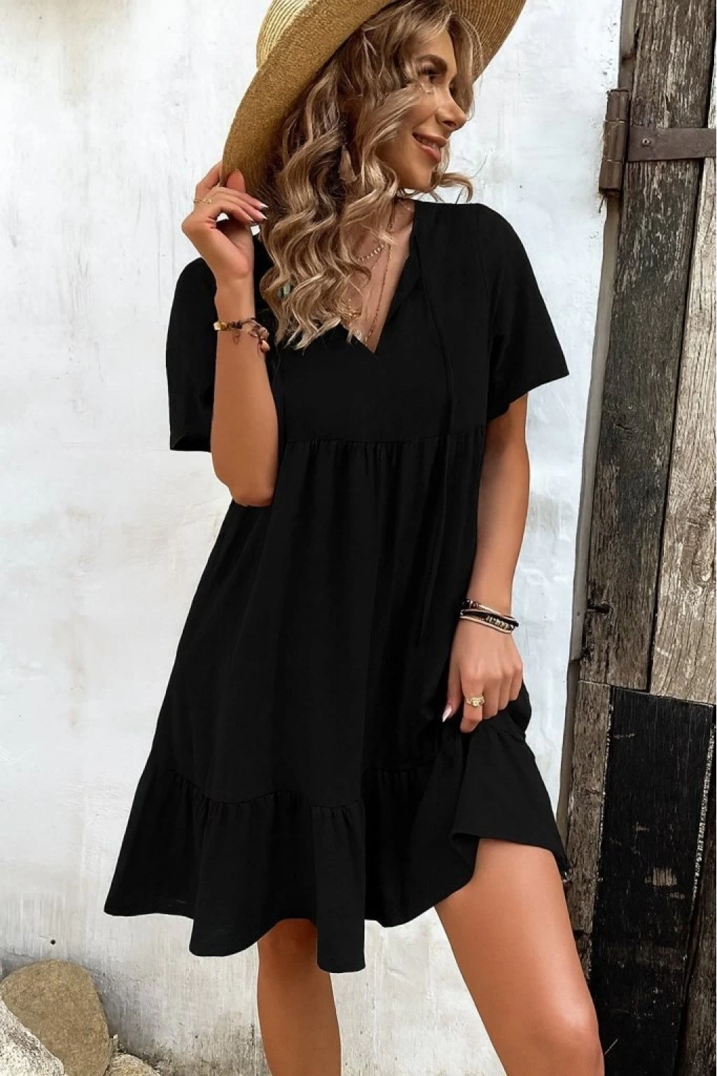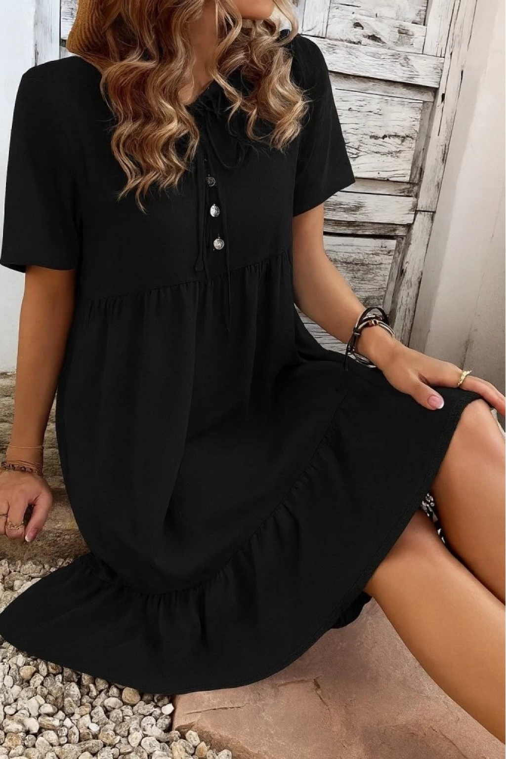 Kadın Kısa Kollu Yakası Bağcıklı önden Düğmeli Fırfır Desenli Süprem Elbise