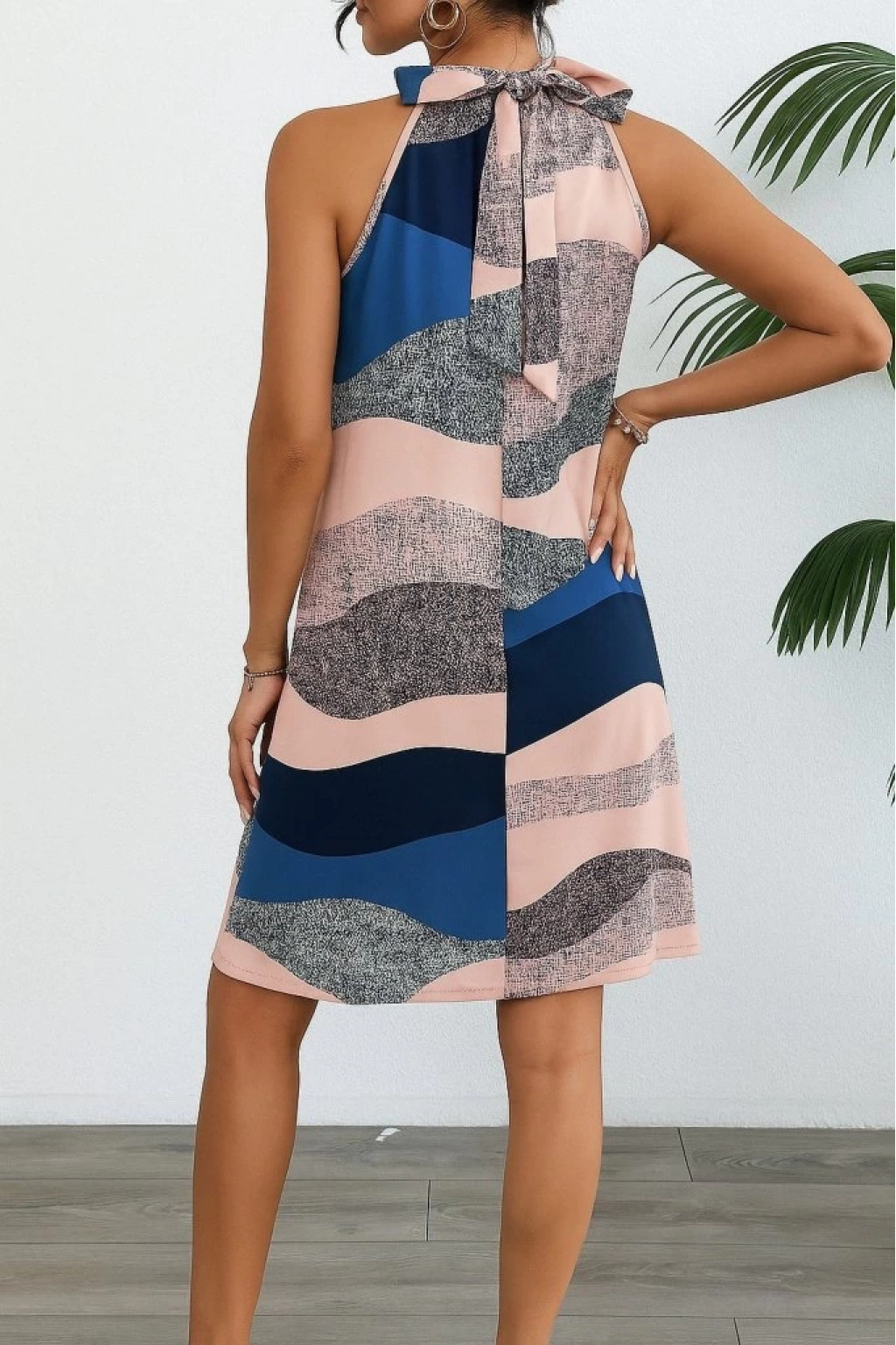 Kadın Kolsuz Boyundan Askılı Desenli Midi Süprem Elbise