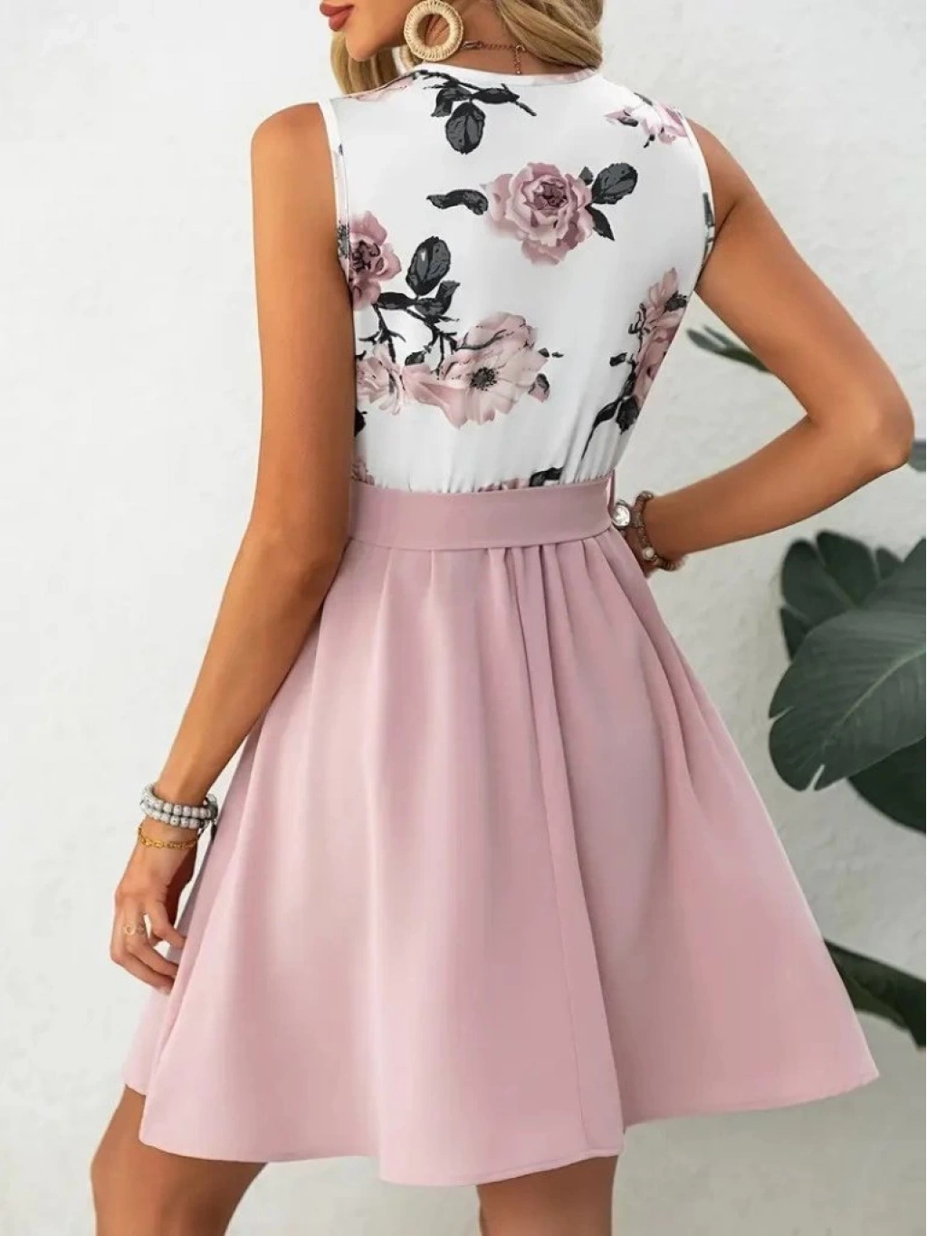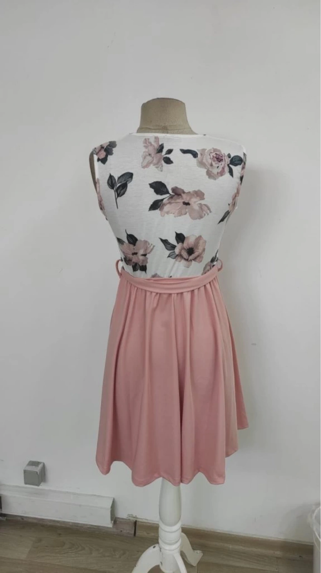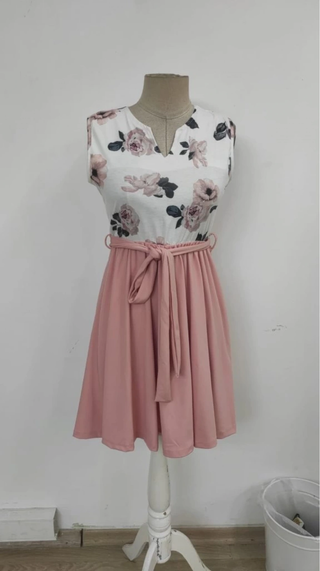 Kadın Sıfır Kollu V Yakalı çiçek Baskılı Beli Kuşaklı Dalgıç Elbise