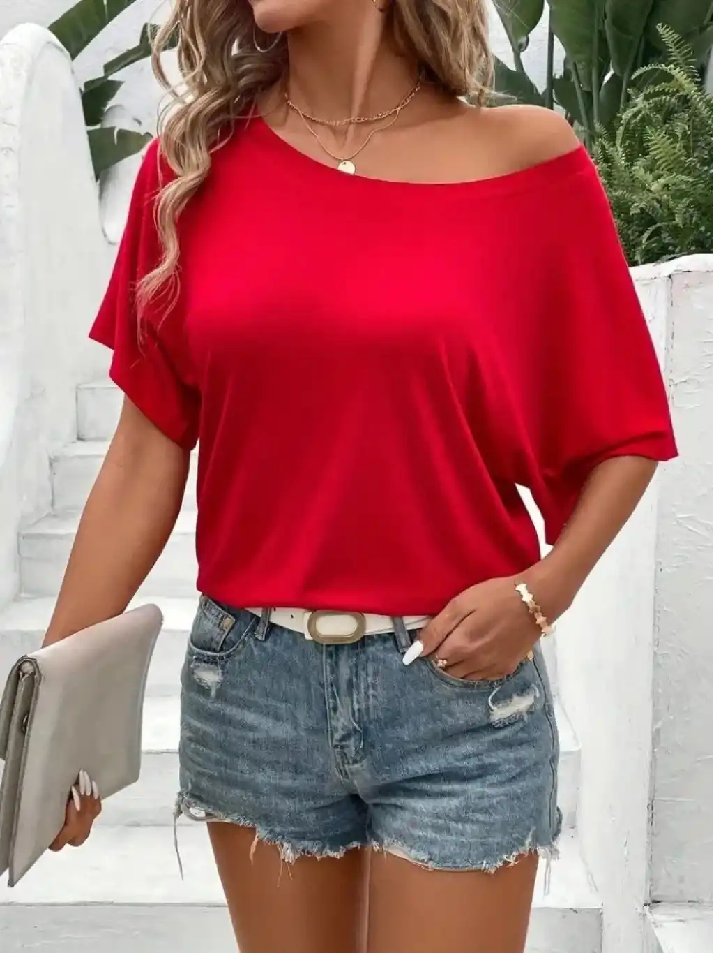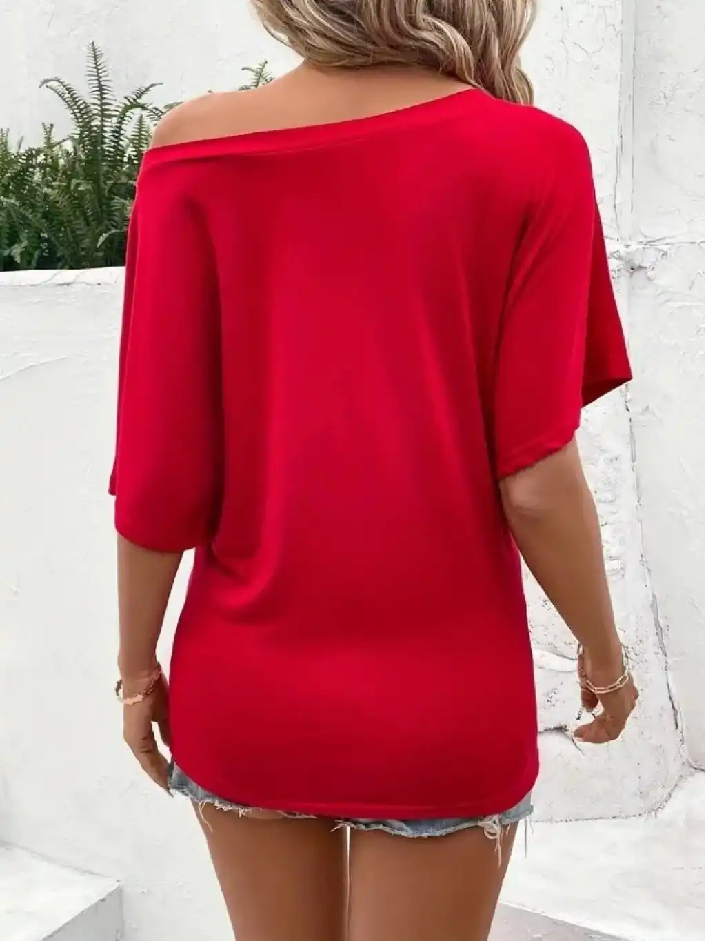 Kadın Tek Omuzu Açık Kısa Kollu Salaş Viskon Bluz