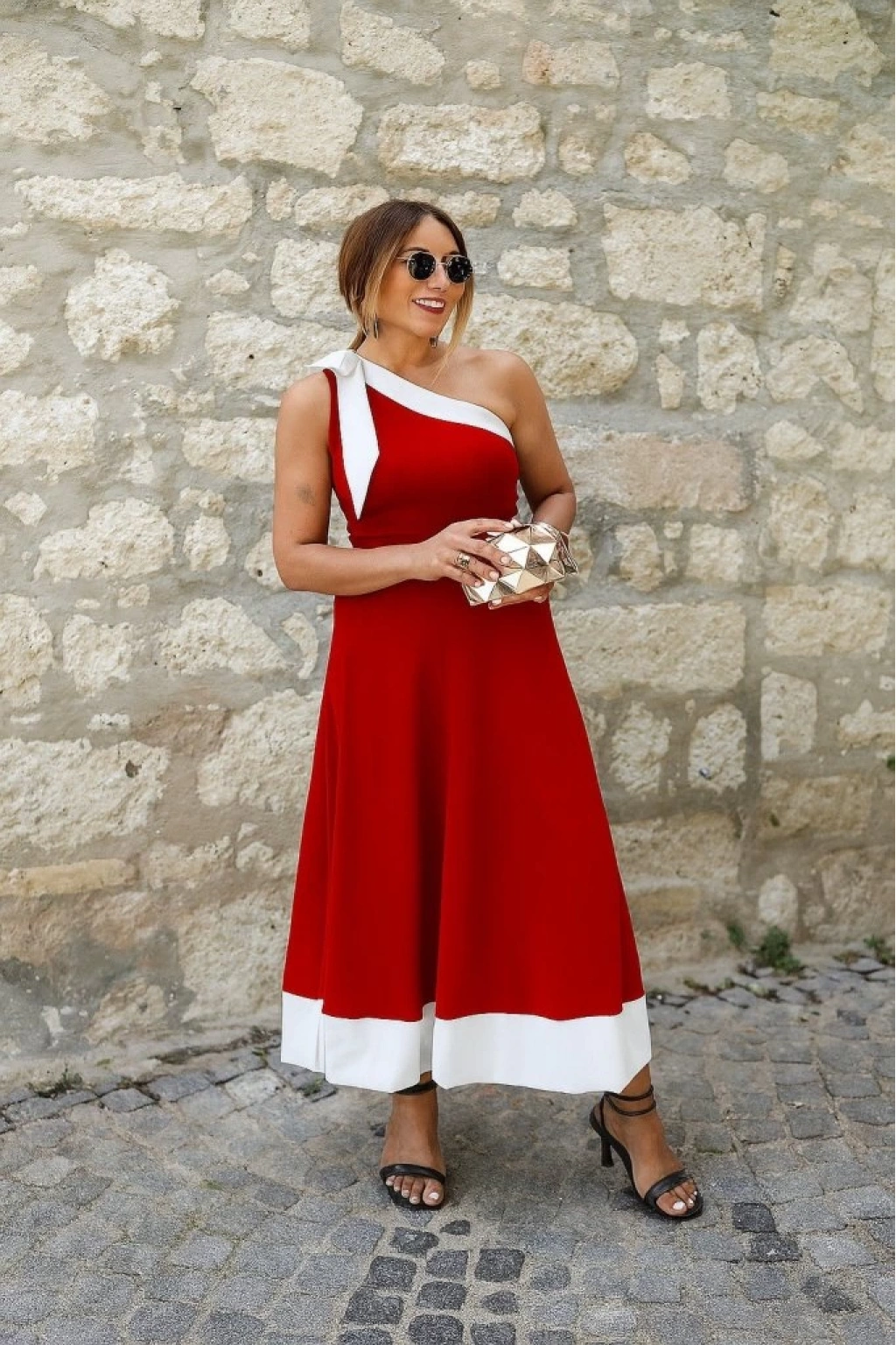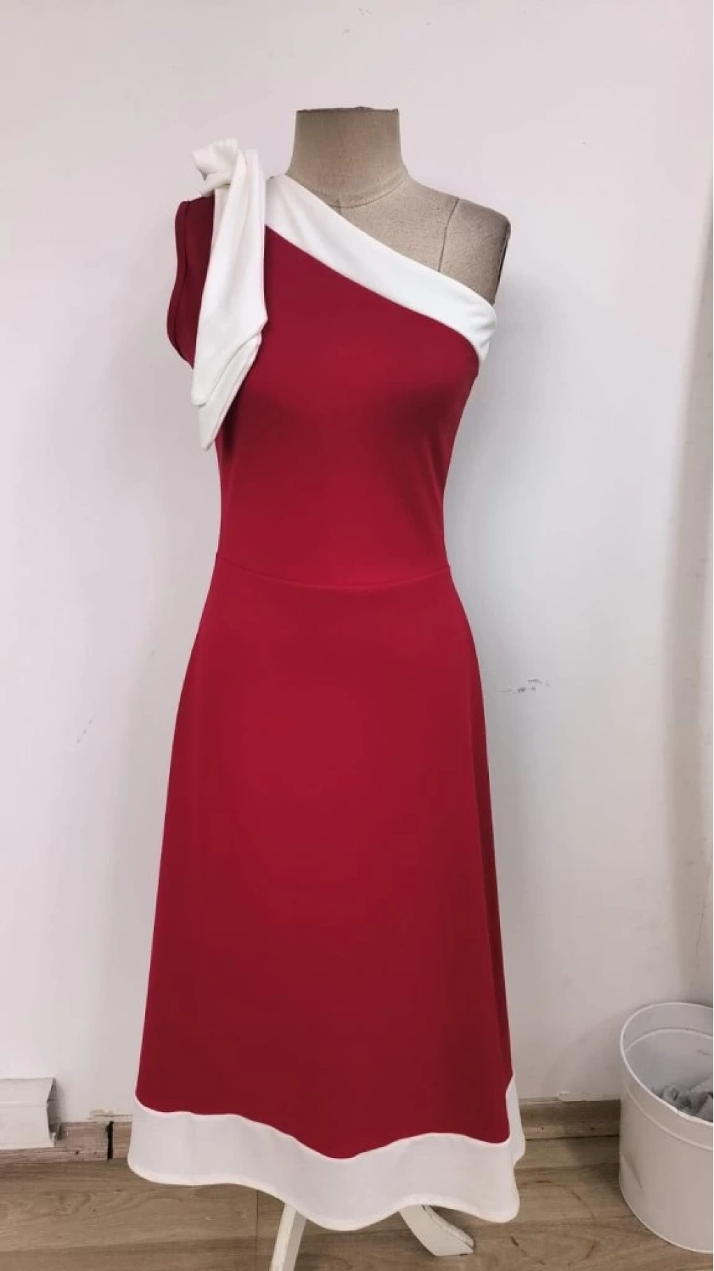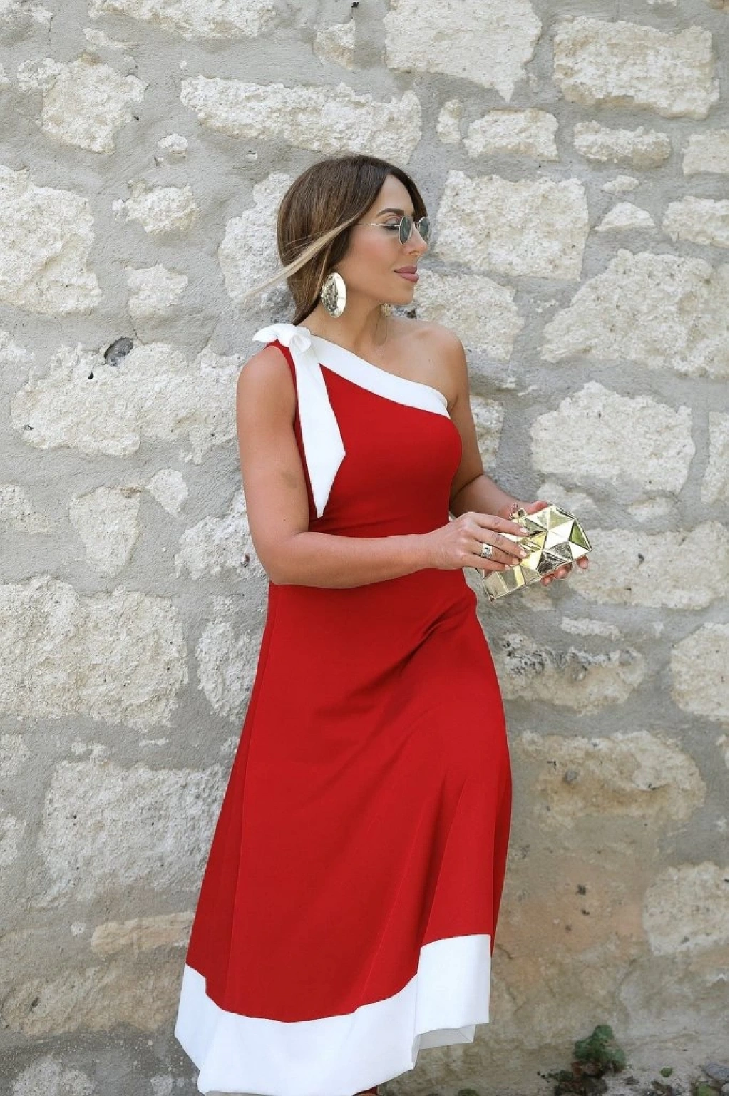 Kadın Tek Omuzu Açık Omuzlardan Kurdela Detaylı çift Renkli Ithal Krep Elbise