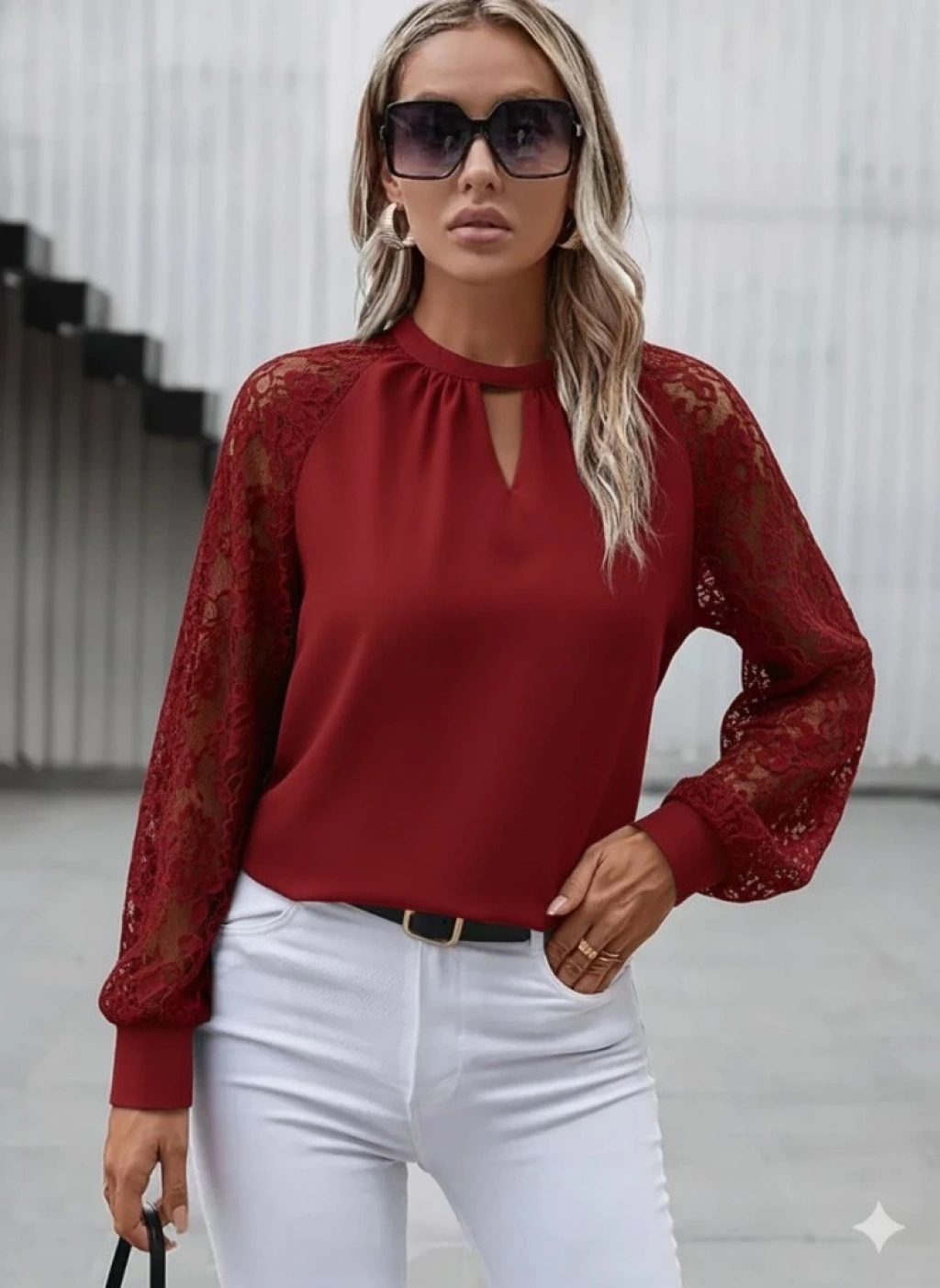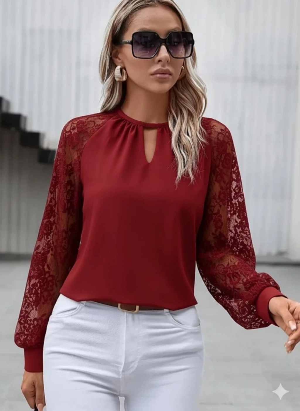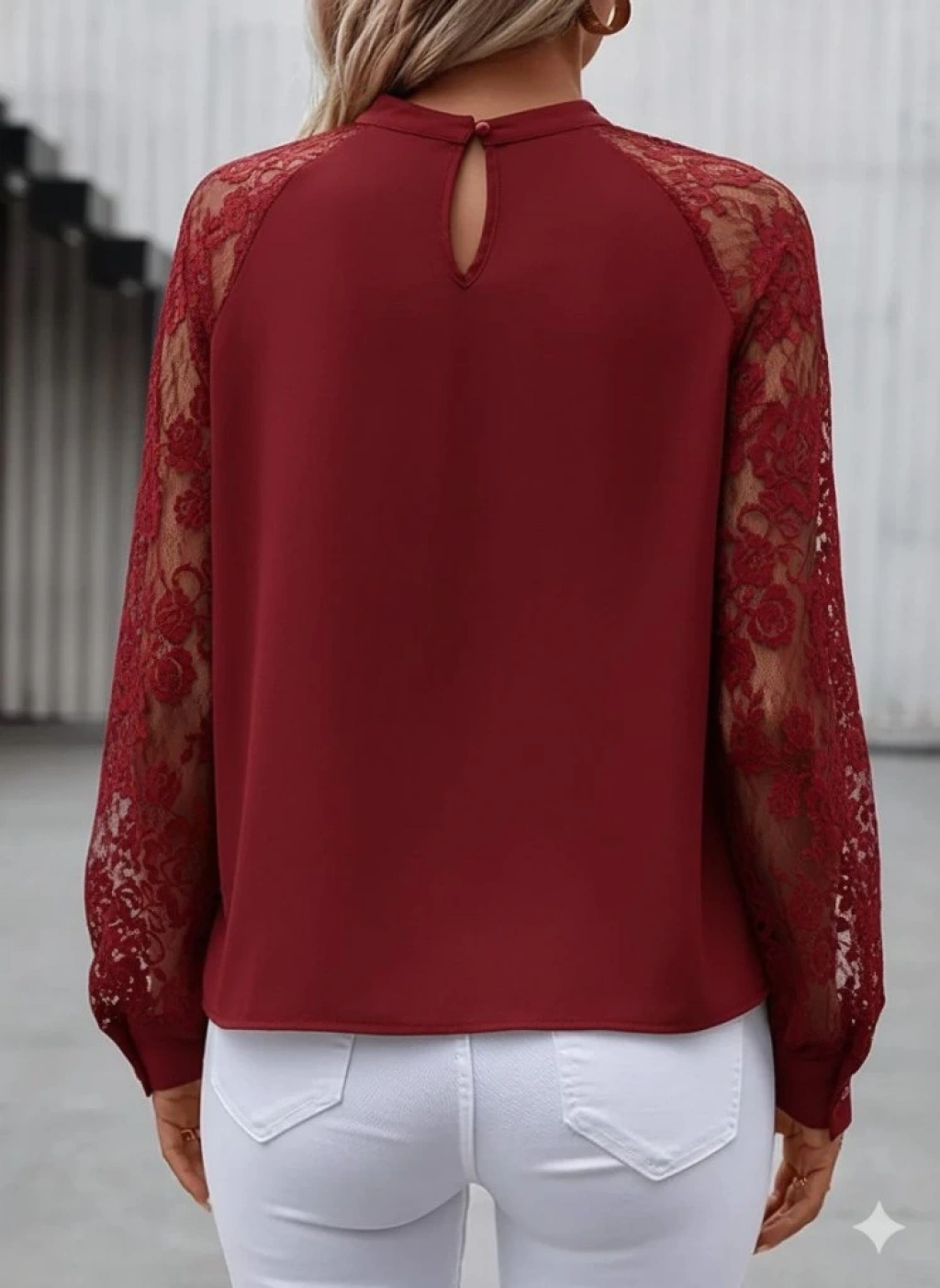 Kadın Uzun Dantel Kollu Yuvarlak Yakalı Sandy Bluz