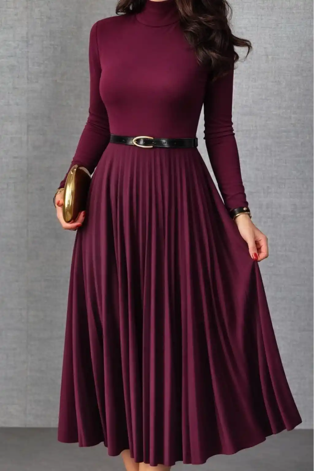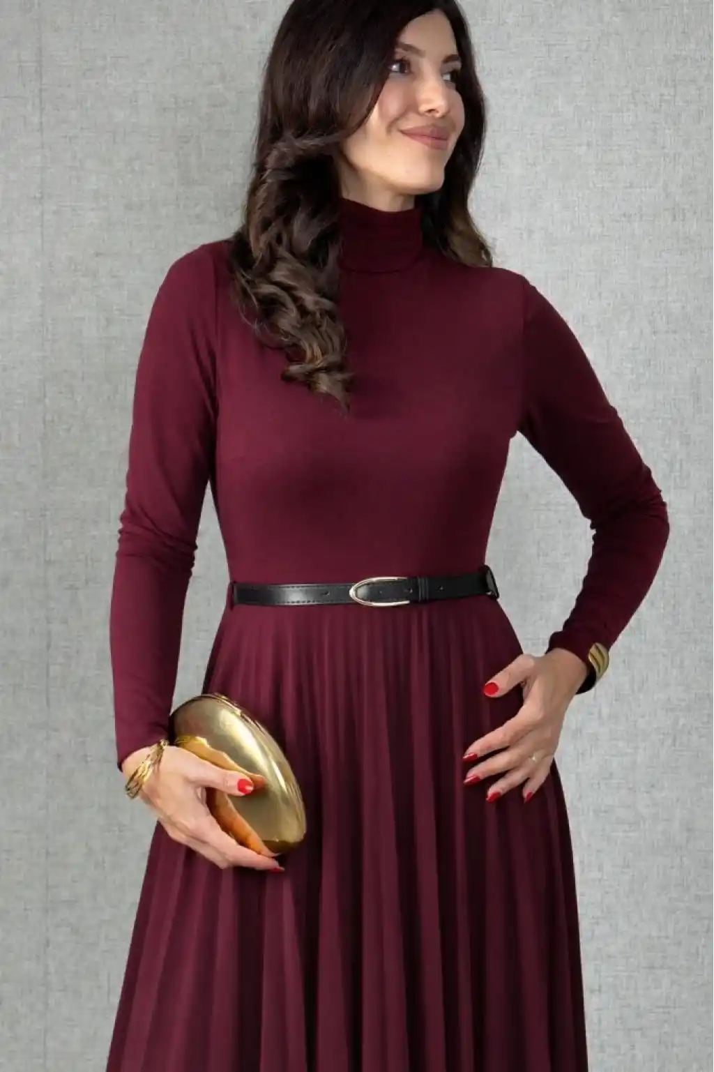 Kadın Uzun Kollu Balıkçı Yaka Kemersiz Pileli Uzun Sandy Elbise