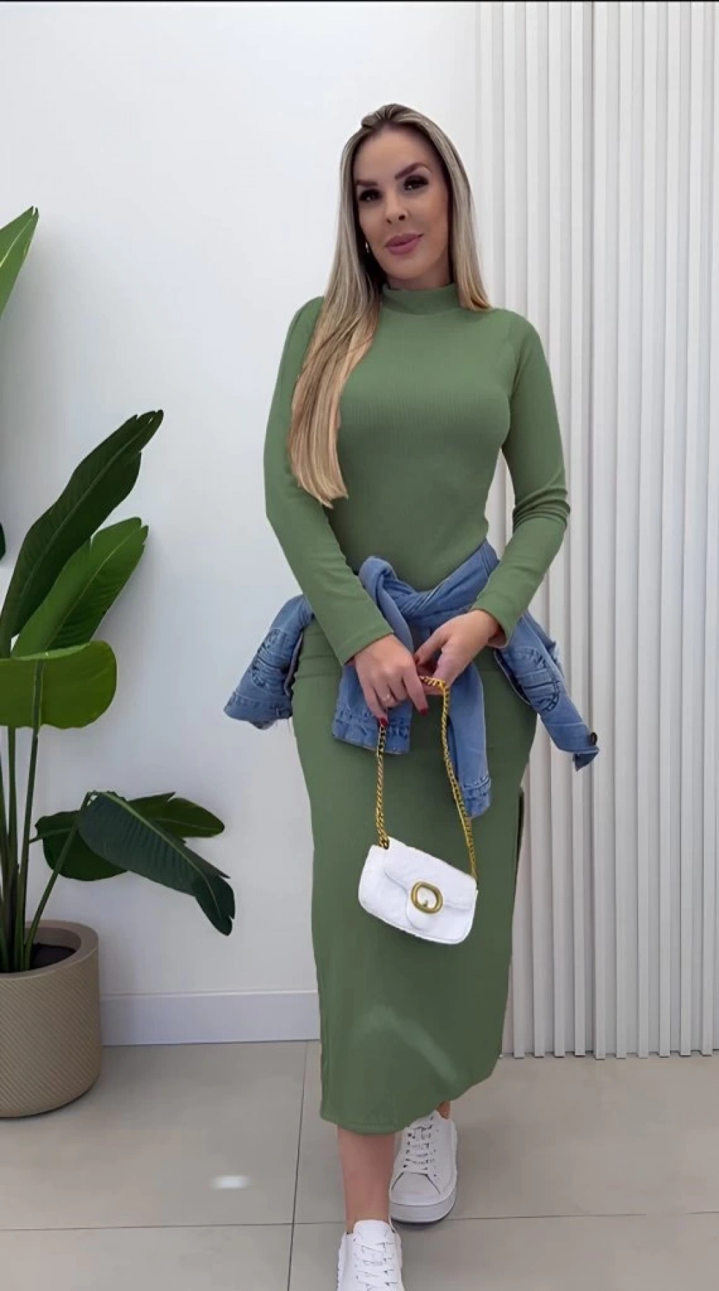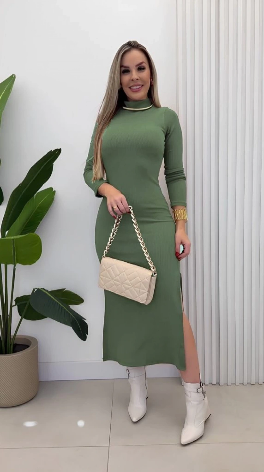 Kadın Uzun Kollu Balıkçı Yakalı Yanlardan Yırtmaçlı Kaşkorse Maxi Elbise