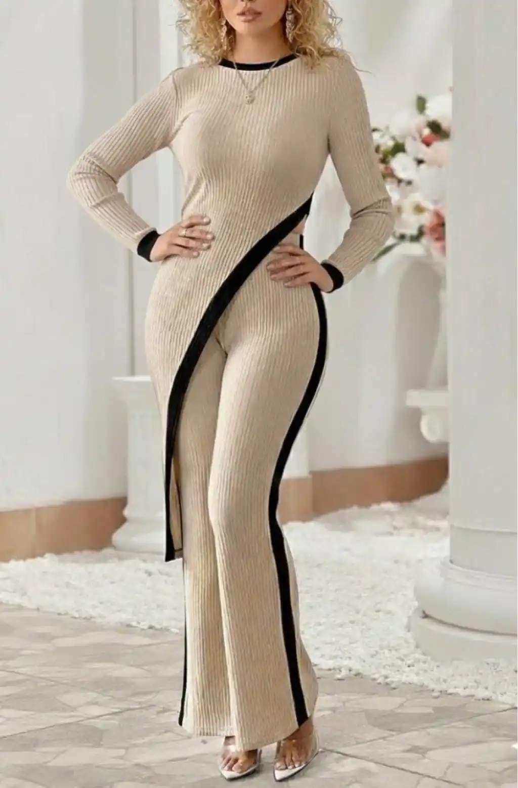 Kadın Uzun Kollu Bisiklet Yaka Asimetrik Kesim Bluz şardonlu Kaşkorse Bluz Ve Pantolon Ikili Takım