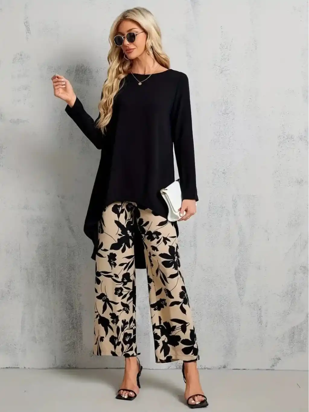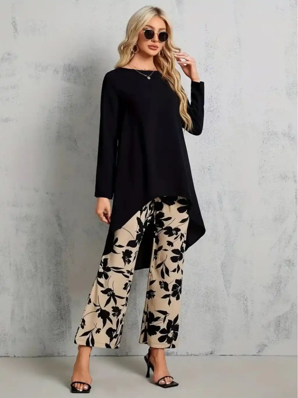 Kadın Uzun Kollu Bisiklet Yaka Asimetrik Kesim Detaylı Viskon Bluz Ve çiçek Desenli Iki Iplik Pantolon