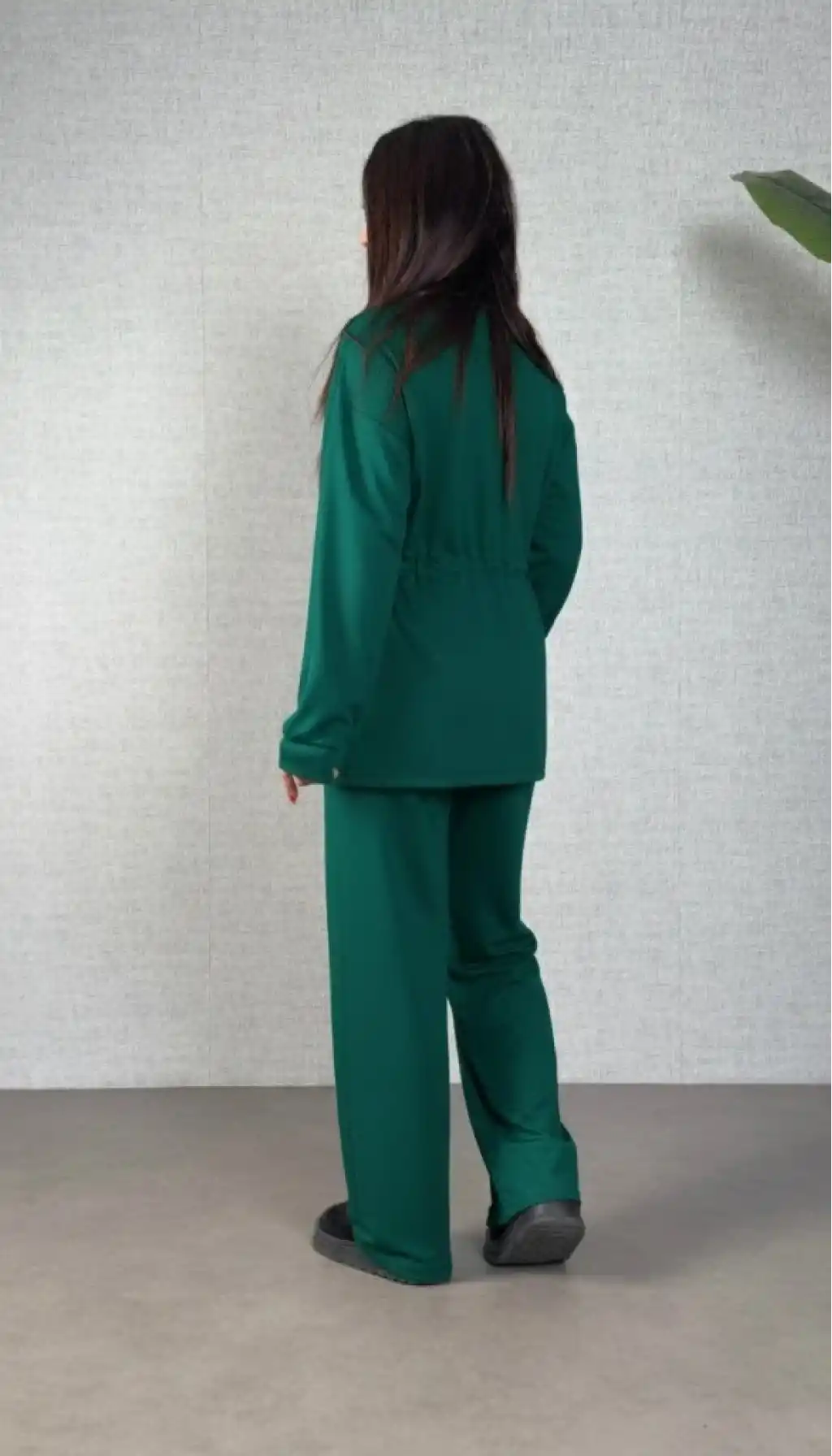 Kadın Uzun Kollu Bisiklet Yaka Belden Büzgülü Bağcıklı Viskon Iki Iplik Bluz Ve Pantolon Ikili Takım